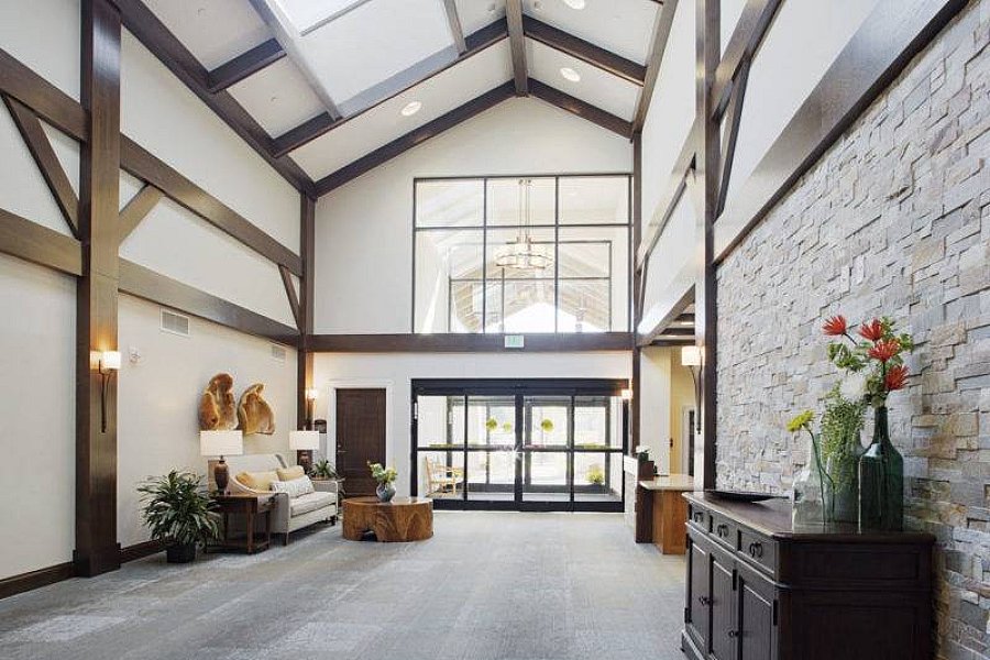 With lodge-style vaulted ceilings and stained millwork/trim, the common area welcomes in residents and their family members. This area also includes a large lobby and reception area, plus commercial office space and training areas for administration and staff members. Located on the lower level of the facility is back-of-house staff and administrative space. This level also provides to the Aldersgate community a home for dialysis and hospice services.