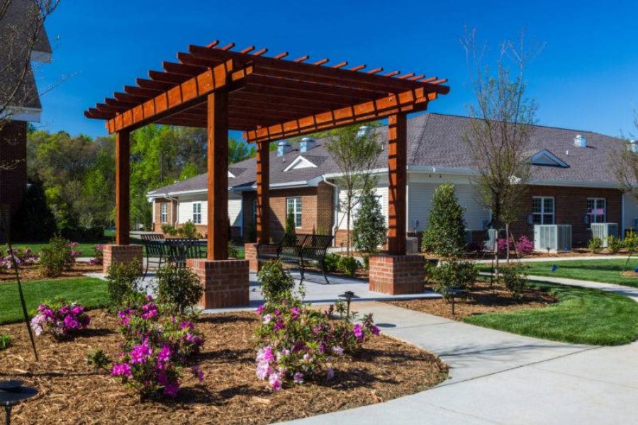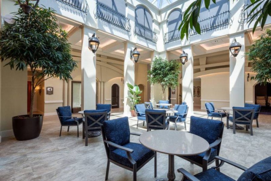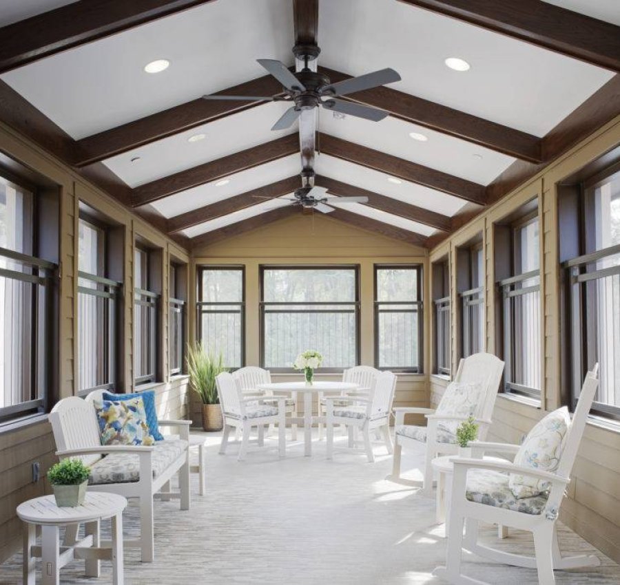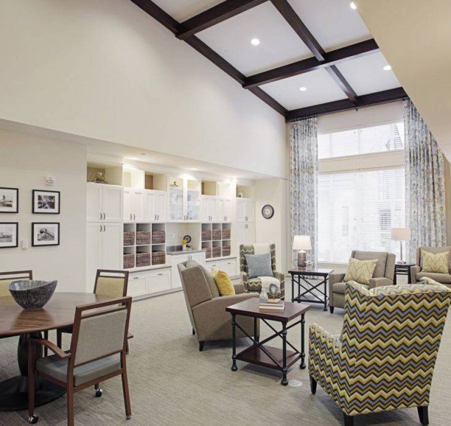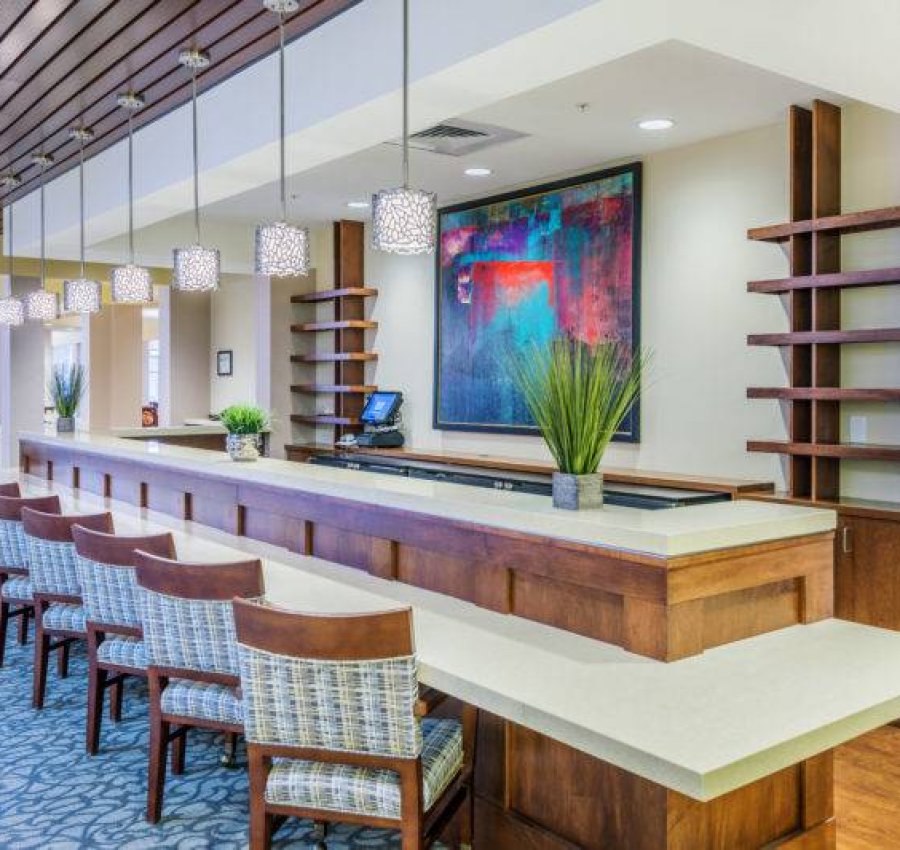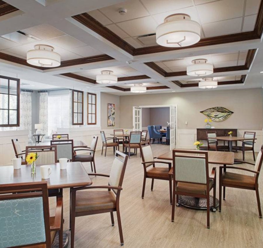 Major renovations at Town Center, the core of Cuthbertson Village, provide life-enriching spaces for residents to interact with each other and their caregivers including a courtyard garden for dining and gathering, movie theater, chapel, and spa/salon.