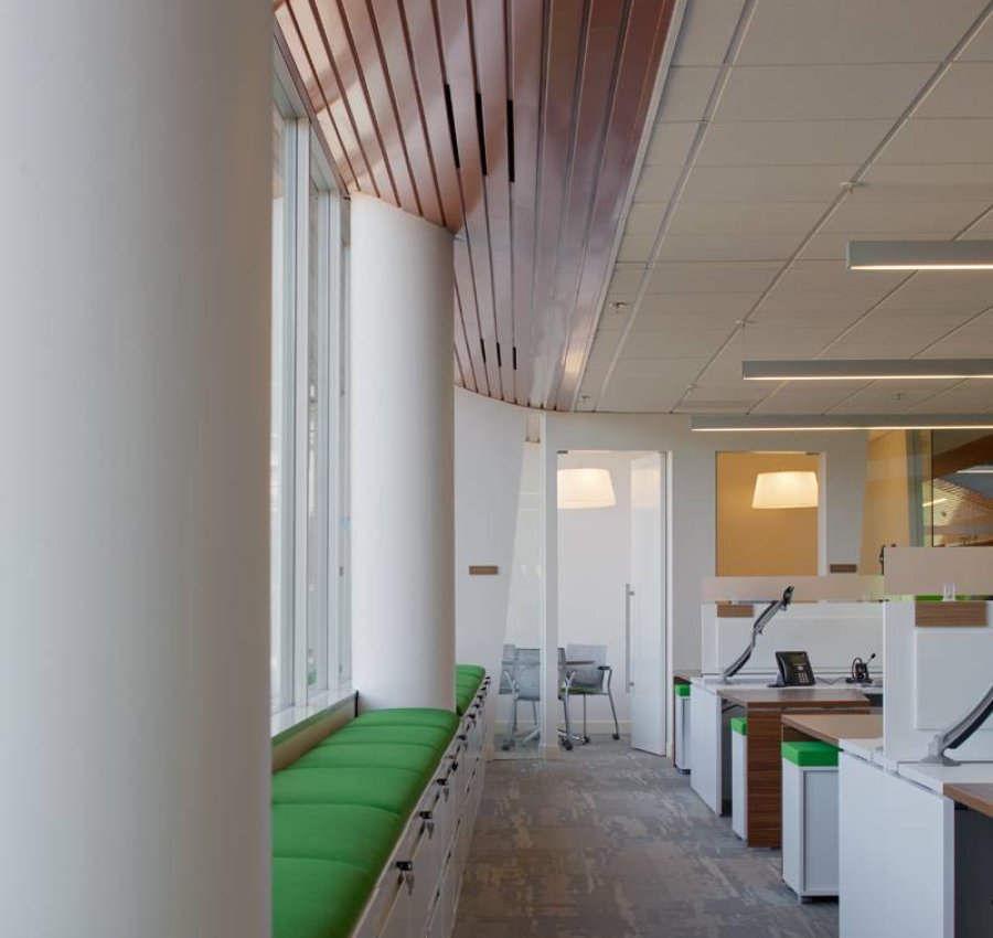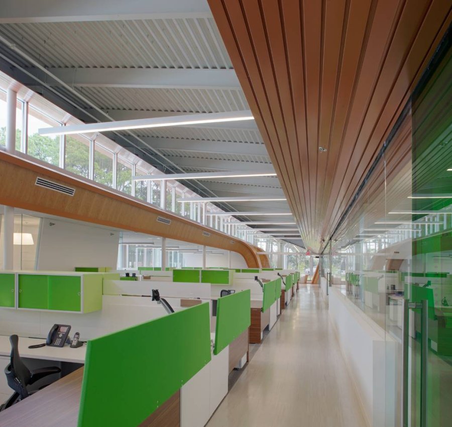 The surrounding campus is improved by the addition of hardscapes, landscaping, and pedestrian walkways that connect the building to the existing buildings and operations on the corporate campus.