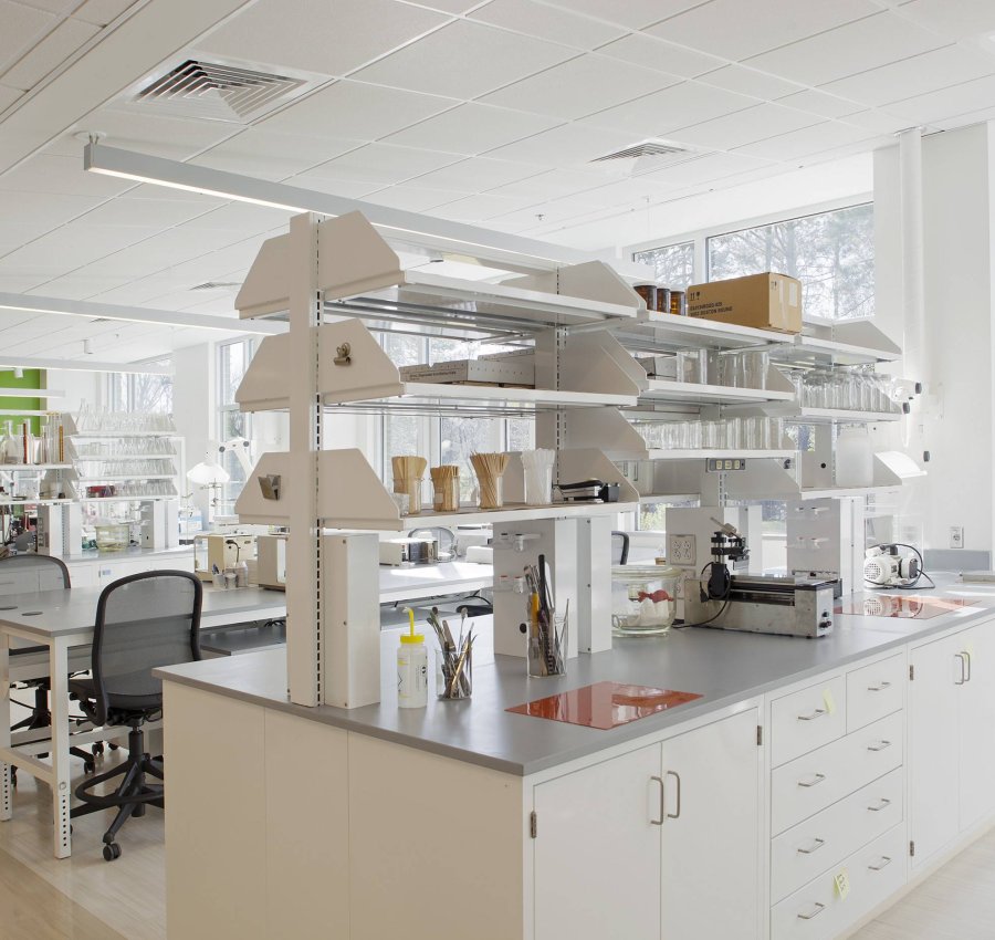 The facility provides 8,000-SF research and development laboratory, executive and administrative offices office, as well as conference spaces. Laboratory space includes wet chemistry labs, 26 fume hoods with two exterior exhausts, and lab casework. The steel structure is clad in brick and curtain wall with contemporary exterior architectural wings made of inverted trusses and metal wall panels. The interior space maximizes natural light from the curtain wall, which is a continuation of the architectural exterior radius feature.