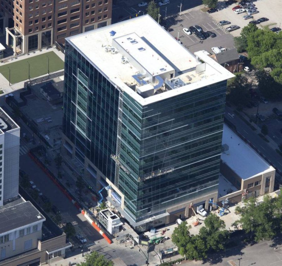 Charter Square is constructed atop an existing City of Raleigh parking deck, posing unique structural challenges which are resolved by a hybrid moment frame design. Charter Square’s steel frame is constructed on a concrete transfer floor, allowing the building’s structural forces to transition to the existing foundation of the parking garage.