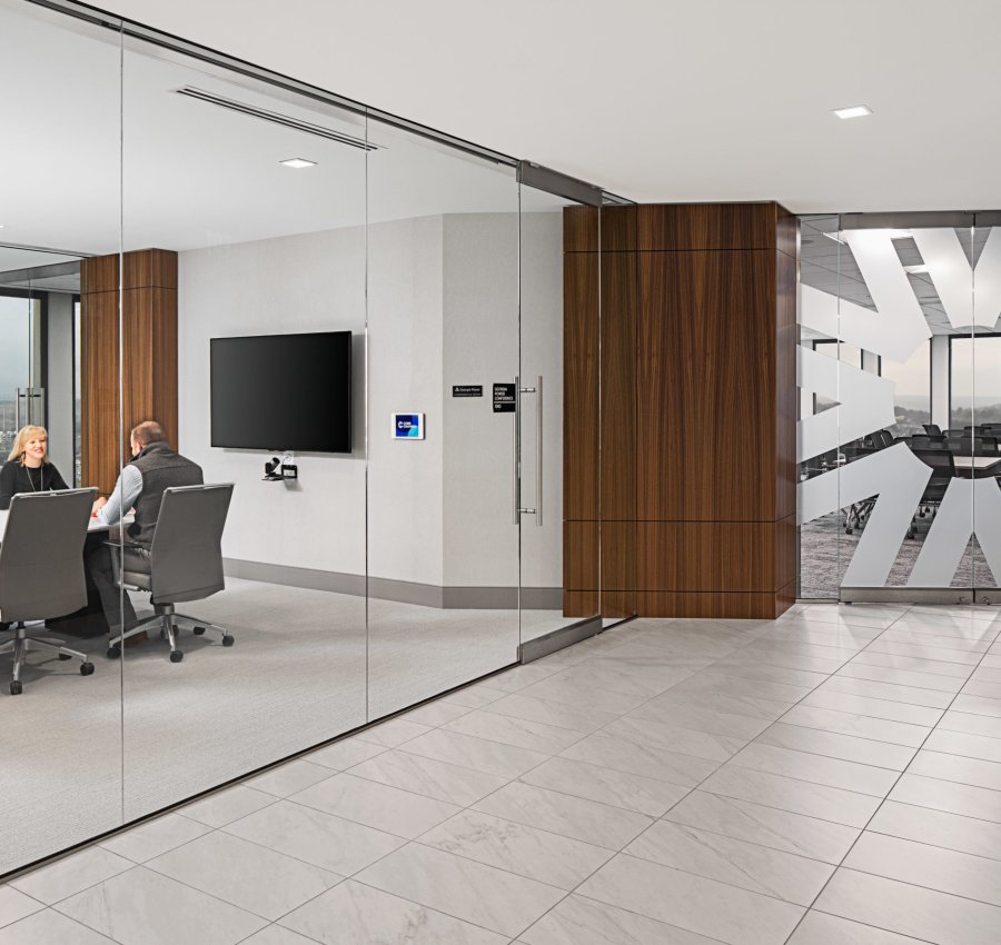 Fostering a collaborative and creative space, the area is enhanced with community areas, quiet rooms, event space for Chamber gatherings, a break room for employees to relax, and a large boardroom featuring a custom 30-foot long stone table. The interior of the built-to-suit office is completed creating an office that is as striking as it is functional.
