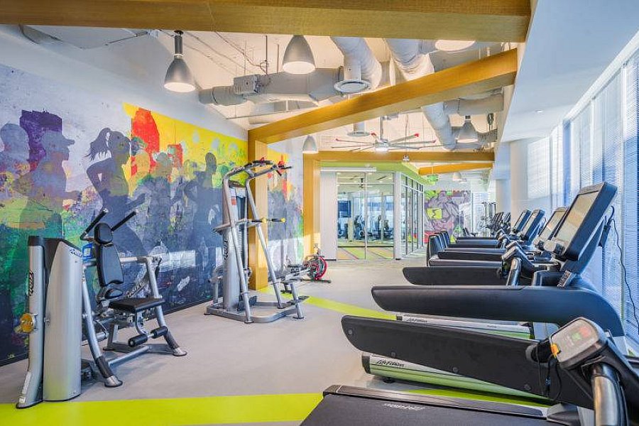 Encouraging workplace camaraderie, a cafe on the second floor features a commercial kitchen and includes indoor and outdoor dining areas. The full-service kitchen features a large pizza oven and walk-in refrigerator and freezer. Additionally, a gym with extensive workout equipment, showers, and yoga rooms allow employees to unwind during their downtime.