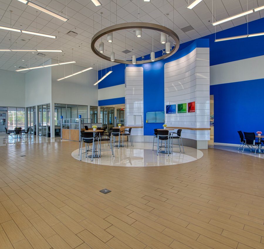 This two-story signature building is the first on the East Coast to house an observation area overlooking the service bays, where clients can watch the ins and outs of the process as their vehicle is being serviced. This transparency is an integral part of the design and layout of this automotive facility, keeping the client involved every step of the way while also providing a glimpse into the extensive work and care performed on each vehicle.