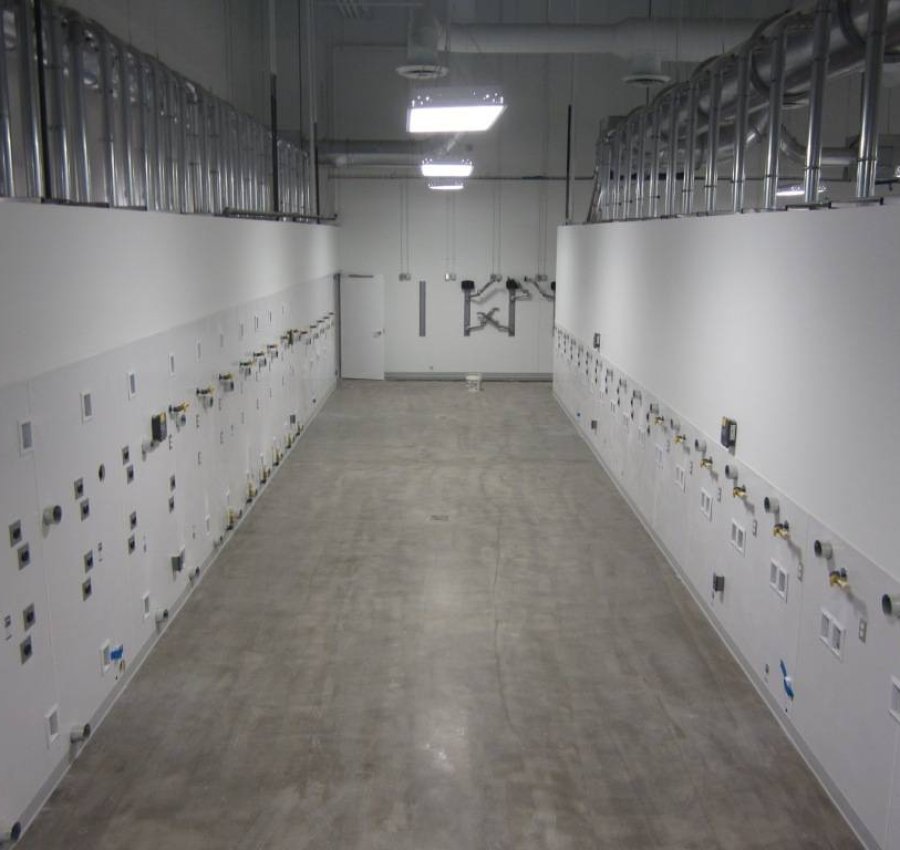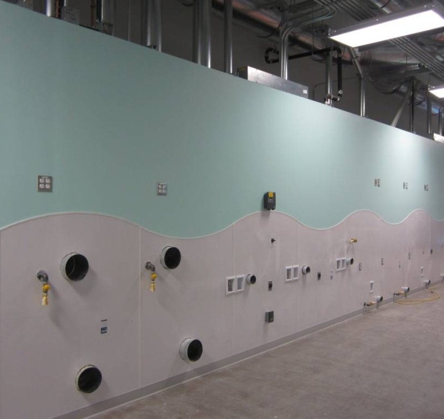 Mechanical and electrical systems for this building are critical; HVAC systems in the test labs are massive AAON units that are completely self-contained, running on their own dedicated control and power system. They will run continuously due to the heat load produced by the dryers and other motor-driven appliances. A water reclamation system is installed as well as a small chiller.