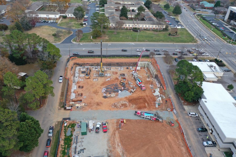 In constructing this multi-faceted redevelopment, the project team removed three existing buildings on the property and excavated roughly 13,000 CY of dirt to make way for this medical office building. To improve the soil condition, mitigate the rock onsite post-excavation, and facilitate the installation of the required 16-foot footings, the team installed a temporary soil nail wall. As the excavation was near a busy pedestrian and vehicle corridor, the project team worked closely with the local municipality and utility provider to relocate power lines and ensure a safe site.