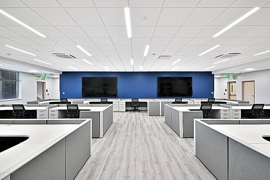 The first floor offers a breakroom, cafeteria, and locker rooms for yard jockeys, who transport containers within the port. The second floor features offices, conference rooms, and an operations center. To maintain consistent operations, the critical data room in the facility is supported by an uninterruptible power supply (UPS), and the entire building is backed by a generator with infrastructure for a secondary portable generator.
