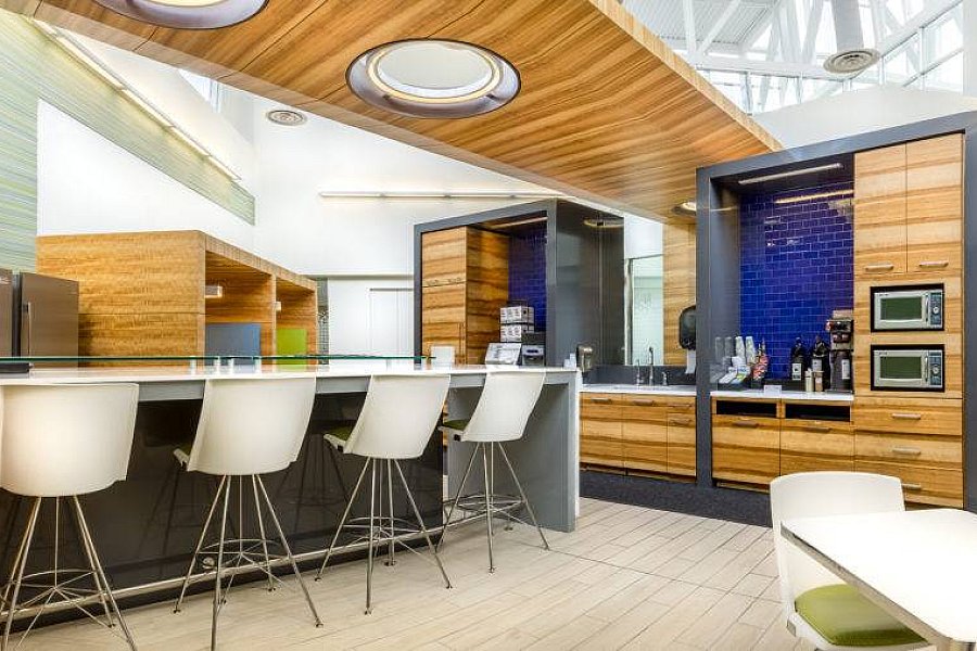 The renovation encourages employee collaboration and engagement. Breakaway rooms made for small conferences include full monitors and backlit LED lighting lining the wall, facilitating mobile conferencing. In the six breakrooms throughout the corporate office, Italian porcelain tile backsplash plus custom millwork panels evoke the modern atmosphere felt throughout the entire office.