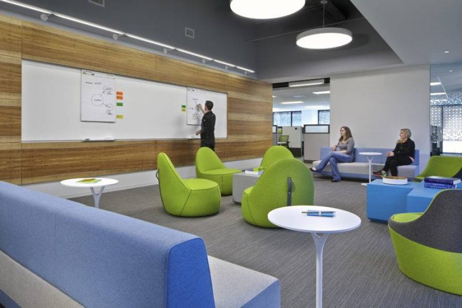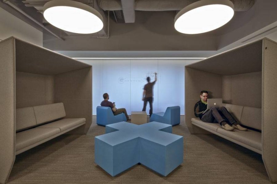 Nearly 80% of the sheetrock in the office is covered with writable wall surfaces, enhancing employee teamwork. Scheduling monitors are installed outside all rooms with meeting capabilities to eliminate any scheduling complications. Wellness rooms provide a place for relaxation and healing for new and expectant mothers or employees feeling under the weather.