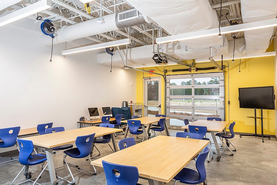 In the education building, the interiors incorporate the school’s yellow and blue colors with baffle ceilings, tiled accent walls, and ceiling clouds. Other interior design elements include colorful lighting, motorized garage doors, and operable wall partitions with whiteboard surfaces in the learning suites. Glass storefronts visually connect closed-off spaces to passageways and common learning areas.