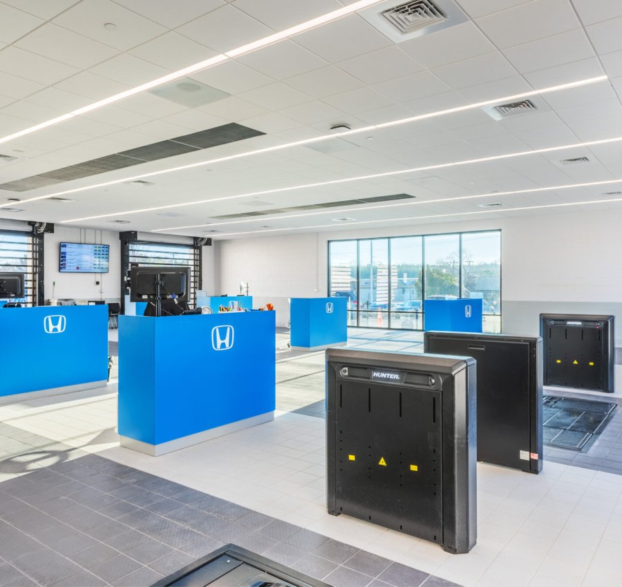 As one of the first completed Honda Blue Stage images in the country, this project required a specialized coordination of trades to execute a full demolition of the building’s façade and incorporate a new steel canopy with ACM and exterior hardscapes. These coordination efforts allowed steel, concrete, lighting, and signage trade partners to work in concert while also maintaining the schedule and ensuring a safe, productive area for customers to enjoy the elevated car-buying experience Honda and Hudson Automotive provide.