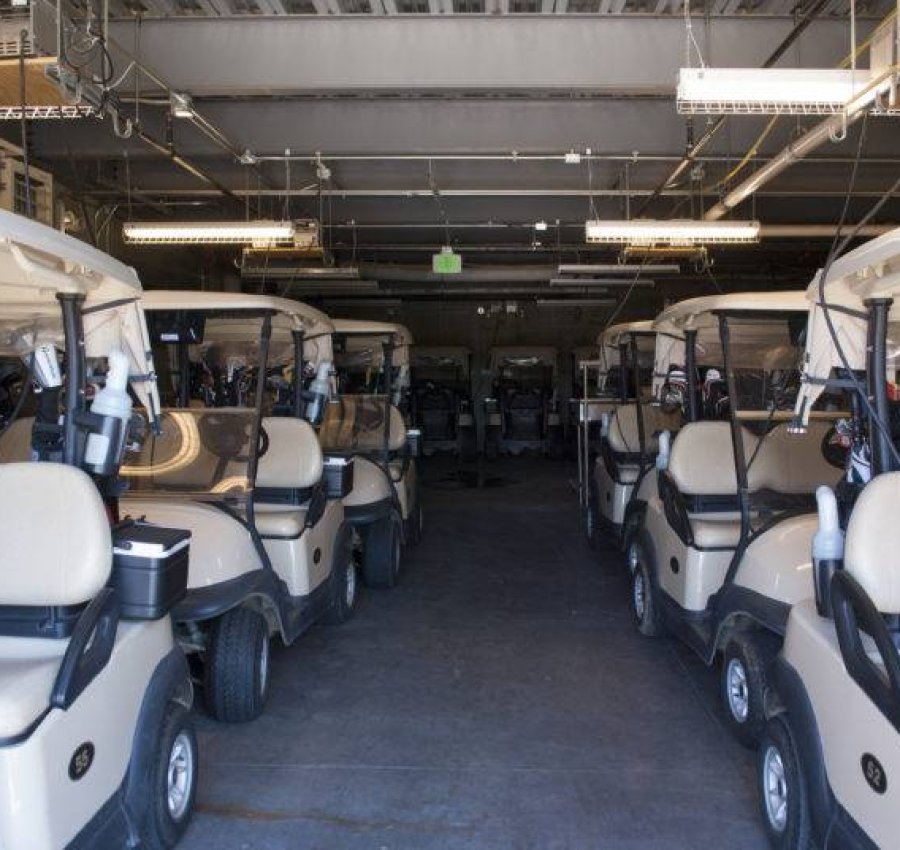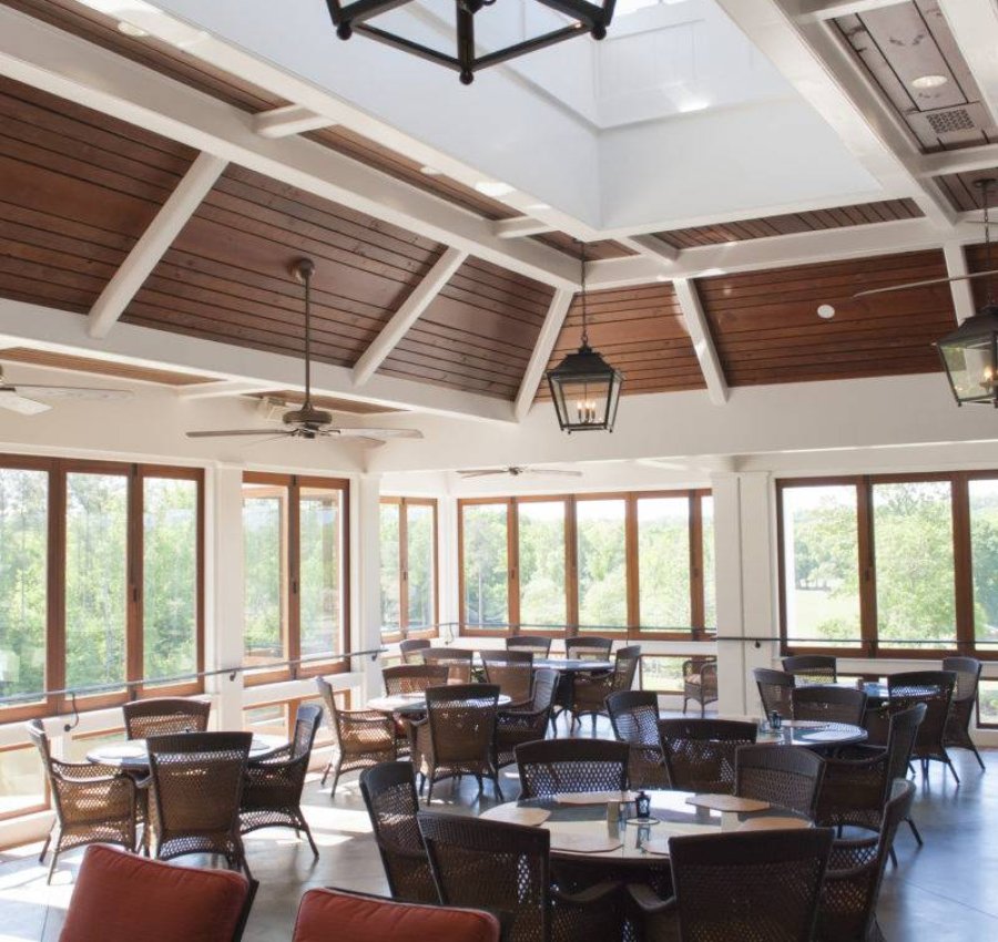 Cart storage is expanded to include washing capabilities, charging station and upgraded laundry facilities. Above this area, a quintessential outdoor Southern dining terrace invites members and guests to enjoy eclectic menu selections while basking in the glow of an outdoor fireplace. The space showcases vaulted tongue and groove wood ceilings and remote operated clerestory windows.