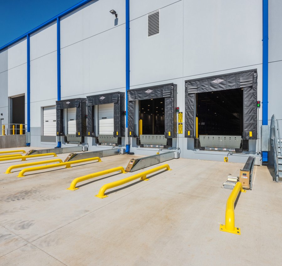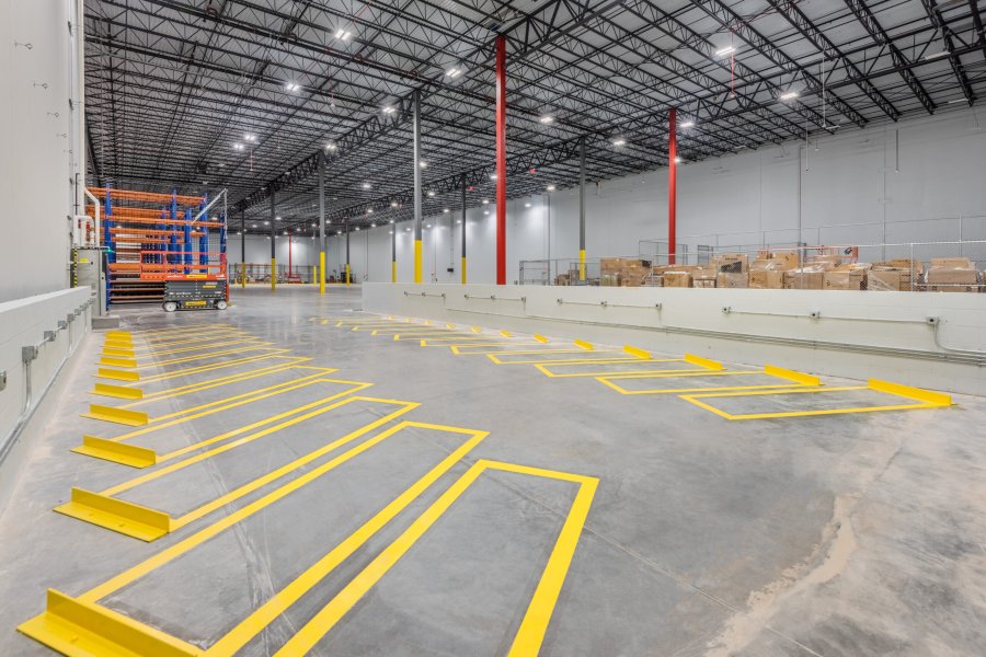 Due to the scale and extensive storage capabilities of this distribution project, the team installed intersection signal lights to fluidly direct forklift traffic in and around the numerous racking aisles and mitigate potential incidents with other drivers.