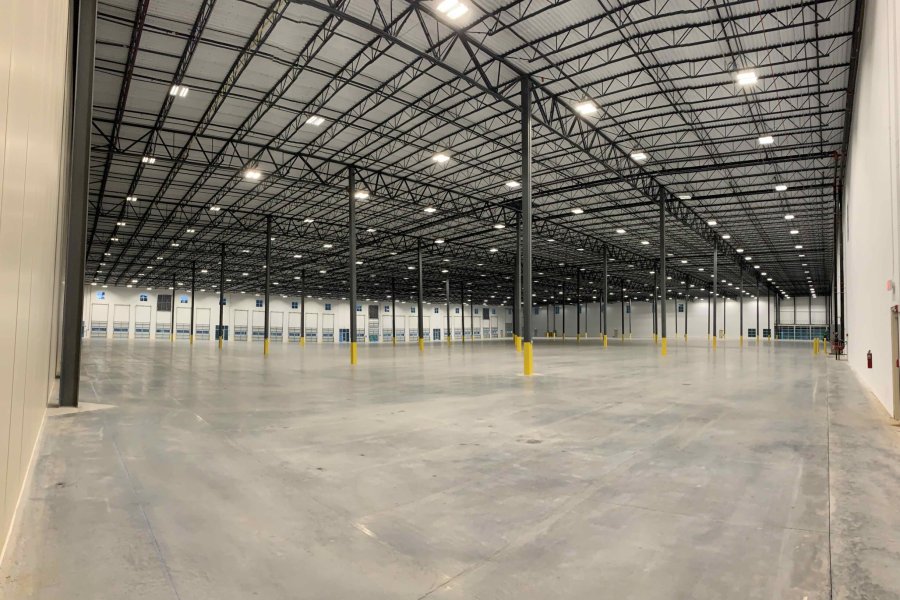 Consisting of tile-up concrete walls, 7-inch slab-on-grade, structural steel and a 45-mil thermoplastic polyolefin (TPO) roof, this project also features an expandable end wall to allow for future growth and flexibility of the space. To provide ample electrical resources for the facility’s tenant(s), a 2,000 amp service and high-bay LED lighting are installed. Impact-resistant curtain wall and round concrete feature columns are used throughout to promote efficiency as well as visual aesthetics.