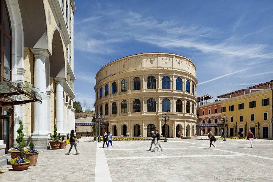 The three-story amenities building, inspired by the Roman Colosseum, houses employee dining and fitness centers, as well as a full natatorium complete with a 1,700-SF indoor pool, sauna and steam rooms, and full locker rooms.
