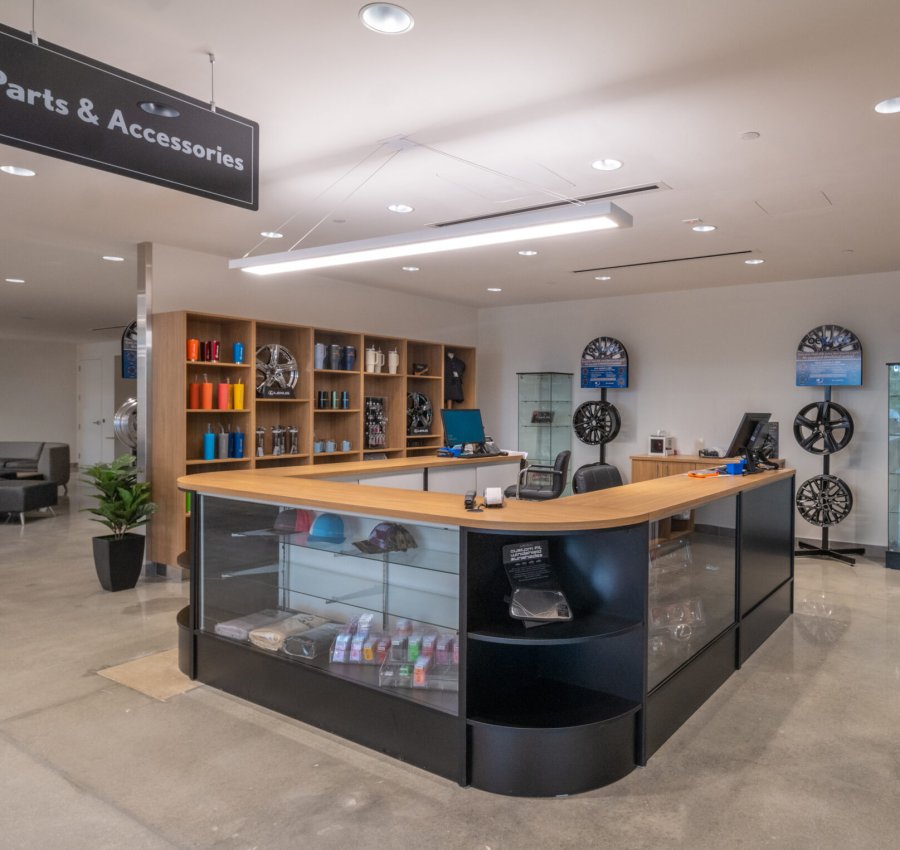Through their proactivity and creativity in deciding to build the Blade Wall as a standalone feature, the team was able to collaborate with design partners to maintain the client’s vision for the space while providing time and cost savings. Today, the feature stands as a striking, distinguishing landmark for the modern, high-end dealership.