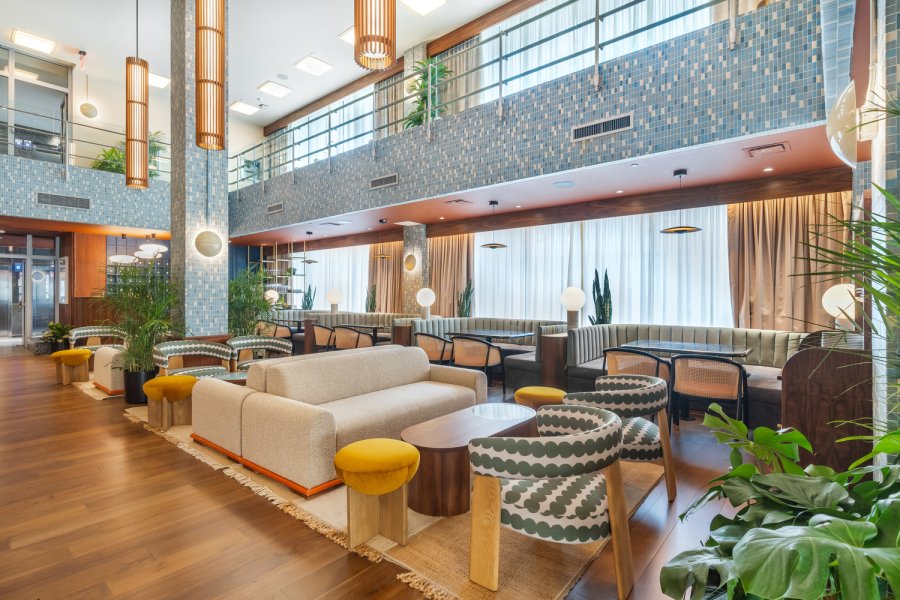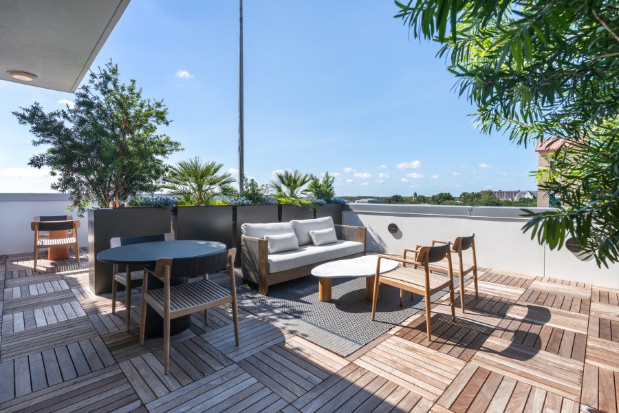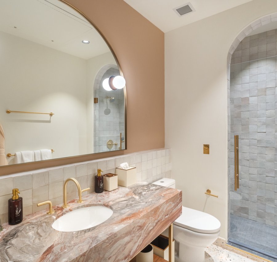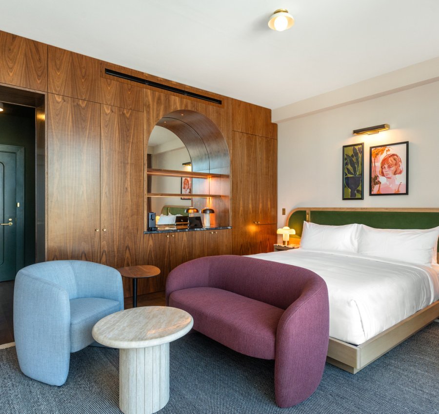 Beyond the preserved historic features, the hotel’s inviting ambiance is further enhanced by soft elements, such as curved walls and walnut arched openings, creating an atmosphere of timeless elegance. Each unit offers high-end finishes throughout, including the “perfectly, imperfect” Zellige tiling in the bathrooms. On the roof, greenery surrounds the shaded chaise lounges and outdoor bar, where guests can enjoy one of the hotel’s signature cocktails. In completion, this newly added gem offers a warm respite from the bustling streets of Historic Downtown Savannah, the Hostess City of the South.