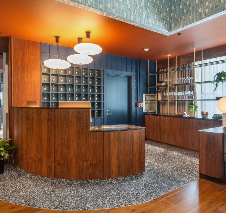 Inside and out, the project team worked closely with the owner, preservation consultant, and design team to preserve historic materials, such as mosaic tile, vault doors, terrazzo floors, ornamental handrails, walnut paneling, and bank teller stations. Adding to the hotel’s one-of-a-kind interior design, custom millwork was introduced throughout the building, including the rooftop, mezzanine, basement, first-floor bars, as well as floor-to-ceiling casework in each unit and custom-fabricated fluted paneling on elevator lobby walls.