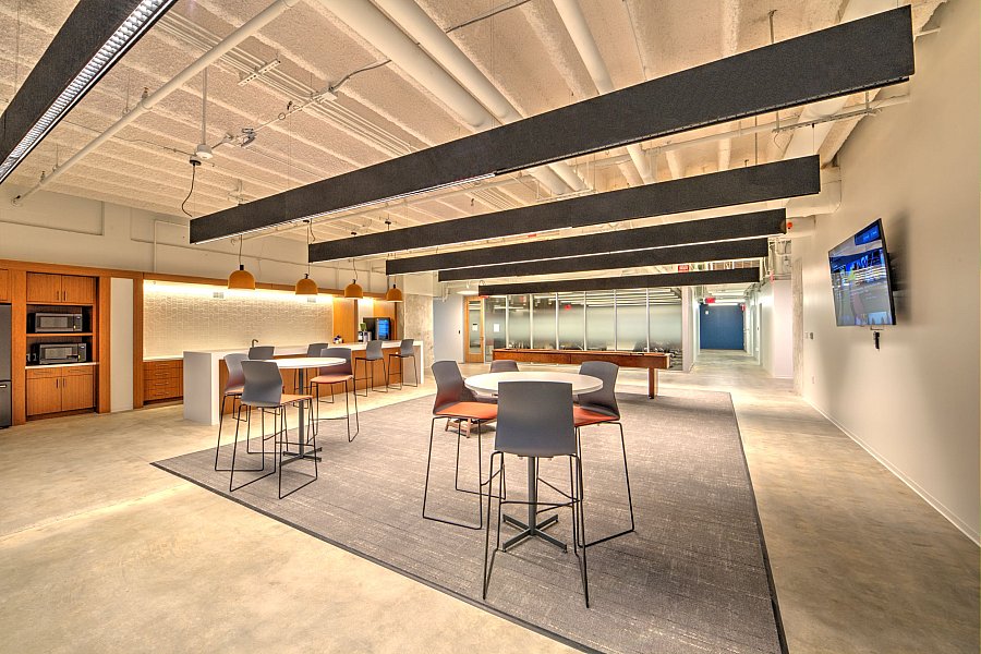 Rounding out this corporate interiors project, the space provides a lounge for tenants to gather featuring gaming tables and fully-stocked kitchen facilities.