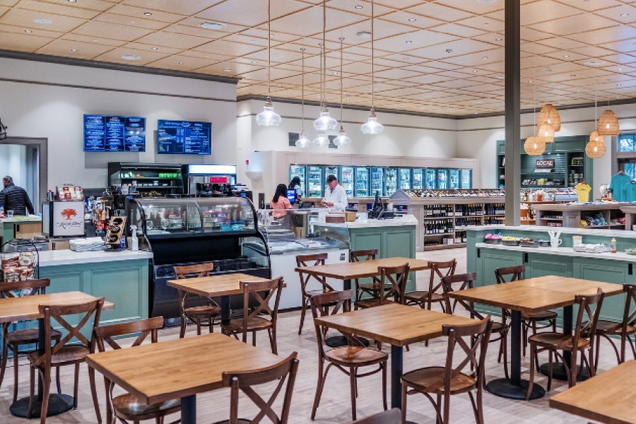 The exterior of the 8,500-SF Market features standing seam metal roofing, decorative fiber cement trim and siding, a wooden deck, and ramps for guest accessibility. Additionally, the interior showcases tongue and groove ceilings delicately designed to reflect the unique, refined experience guests can expect while visiting Kiawah Island Golf Resort.