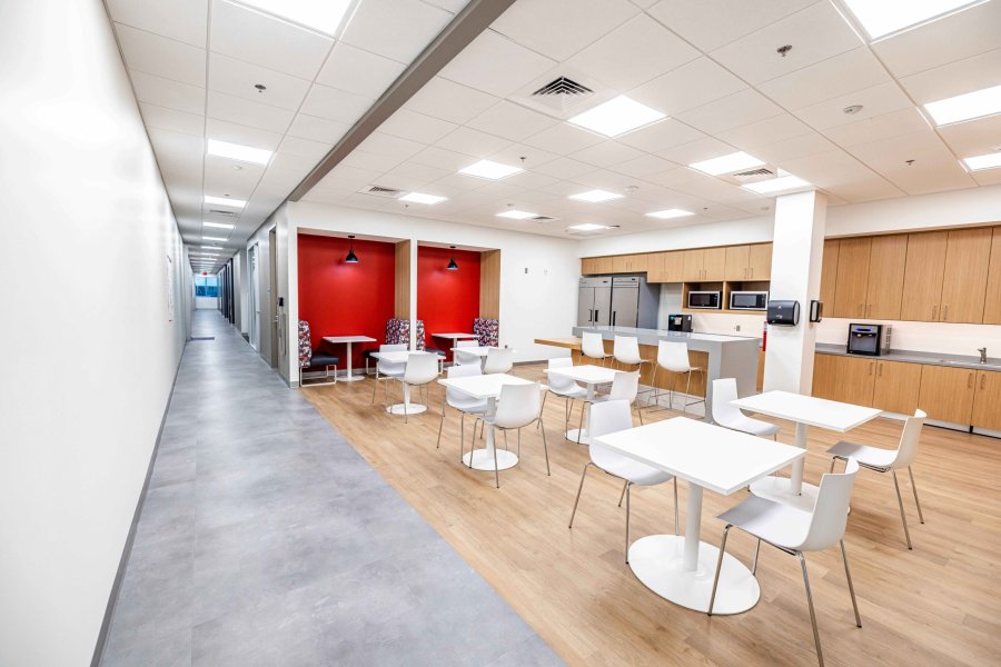 The interior spaces have been carefully designed to create an ambiance of comfort, teamwork, and cleanliness. Luxury vinyl flooring, carpet, wall graphics, and acoustical panels have been used to enhance the workspace and promote a welcoming and collaborative environment.