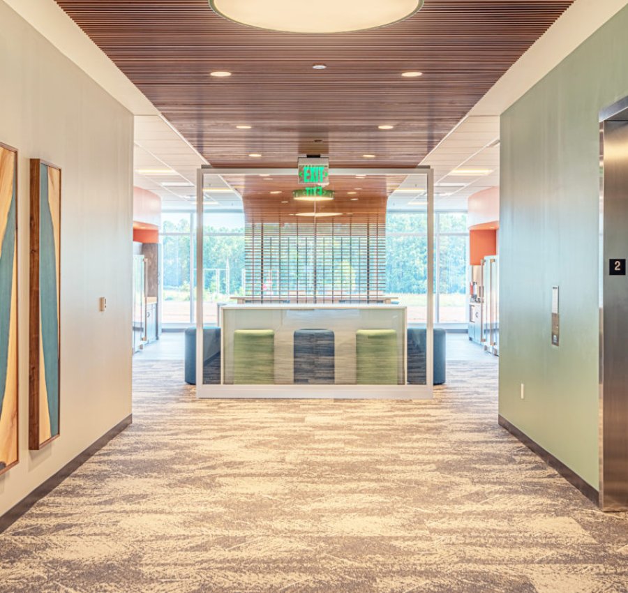 The modern five-story building features structural steel and a precast and curtainwall exterior. Following the completion of the core and shell building, Choate Interiors completes this striking, modern upfit. Each of the five floors offers a differing layout, with both open and enclosed office spaces. Open group collaboration spaces on each floor promote a fluid, creative working environment. Game room areas offer employees a space for teambuilding or a place to relax.
