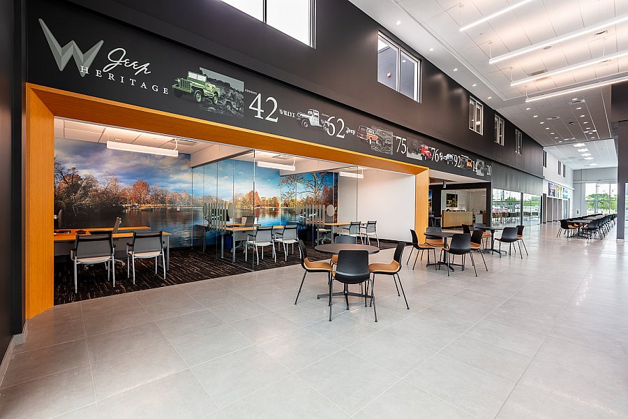 The striking two-story dealership was thoughtfully designed and constructed to reflect the energy of the Hudson Automotive brand, offering abundant natural light and open, welcoming spaces throughout. The first floor features a grand showroom, expansive sales offices, and a sophisticated vehicle delivery area surrounded by a modern glass bi-folding door system – seamlessly blending indoor refinement and outdoor adventure environments.