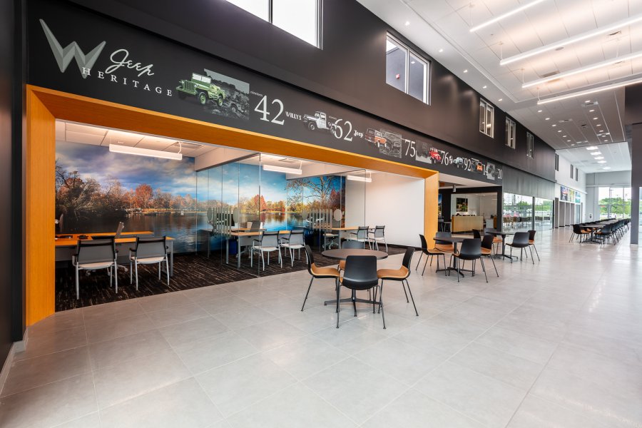The striking two-story dealership was thoughtfully designed and constructed to reflect the energy of the Hudson Automotive brand, offering abundant natural light and open, welcoming spaces throughout. The first floor features a grand showroom, expansive sales offices, and a sophisticated vehicle delivery area surrounded by a modern glass bi-folding door system – seamlessly blending indoor refinement and outdoor adventure environments.