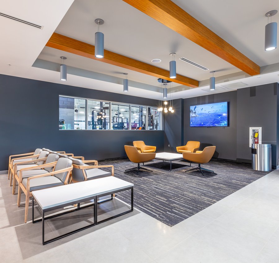 Above, the second story provides critical operational space, including workstations, private offices, and conference rooms to support dealership operations. Atop this level, employees and clients can relax on the outdoor covered terrace, complete with a built-in kitchenette and raised pedestal paver system. This unique amenity was designed to foster connection and community within the dealership team and clients.