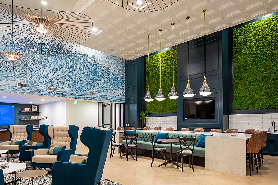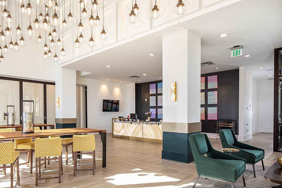 On the third floor, an elevated, resort-style pool deck overlooks the River and offers a poolside kitchen and entertainment area. Just inside, the River Lounge brings residents a cool place to socialize, play games, and entertain their guests. The complex also includes a 24/7 fitness center, pet spa, dog run, outdoor movie screen, and the Garden Lounge with a coffee bar and co-working space.