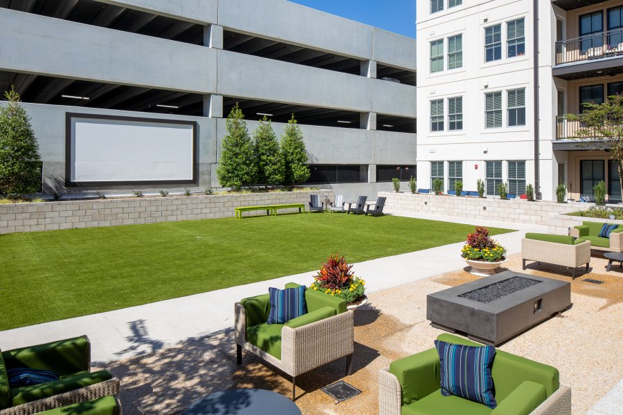 On the third floor, an elevated, resort-style pool deck overlooks the River and offers a poolside kitchen and entertainment area. Just inside, the River Lounge brings residents a cool place to socialize, play games, and entertain their guests. The complex also includes a 24/7 fitness center, pet spa, dog run, outdoor movie screen, and the Garden Lounge with a coffee bar and co-working space.