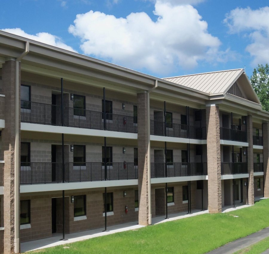 Providing a comfortable and efficient living space for 144 airmen, this three-story dorm features two wings of four-person living modules connected by a central Commons building. The dormitory is constructed of reinforced concrete foundation and floor slab, structural steel framing, and a CMU masonry veneer façade with a metal standing seam room system.