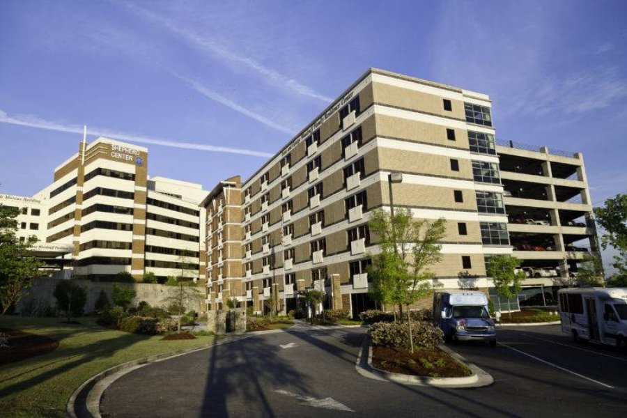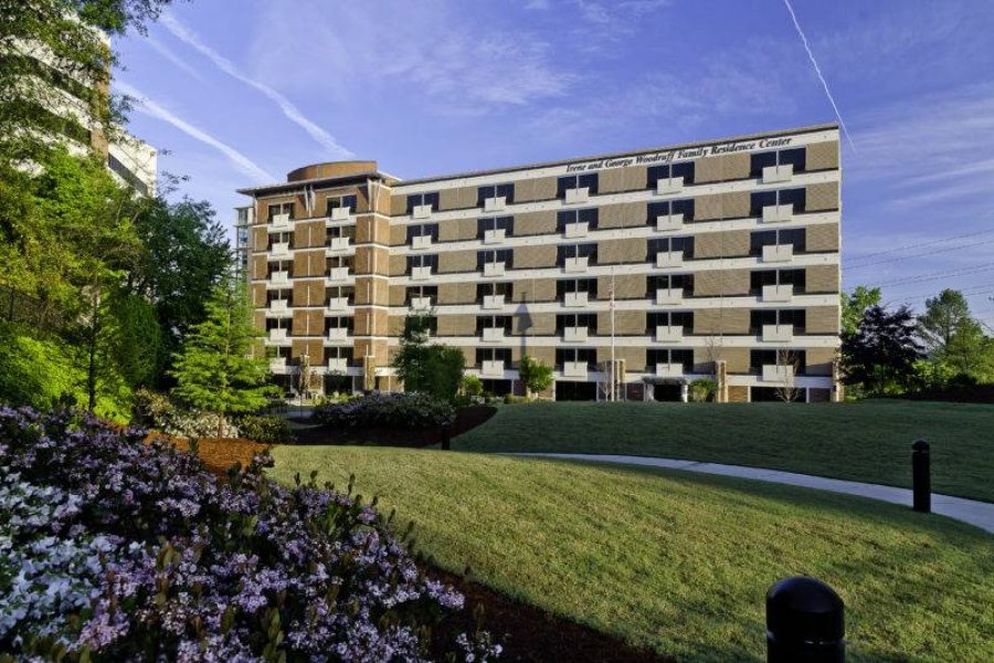Next came the Irene & George Woodruff Family Residence Center & Parking Deck, a seven-story family resident housing building and eight-story precast parking deck. Adjacent to the Shepherd Center and sharing the site’s tight footprint, these facilities allow loved ones to be near their family during rehabilitation.