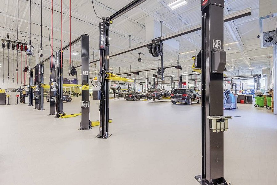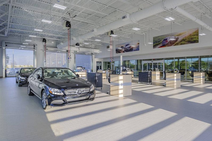 An accommodating service department provides a fully conditioned service drive and customer drop off area, a 27 bay service shop, 4 detail bays, new car delivery area, and used car appraisal bays — all of which feature full vision high-speed Rytec roll-up doors and clinker tile covering the floors. The parts department of Sonic Mercedes McKinney implements radio frequency identification (RFID) technology for processing inventory.