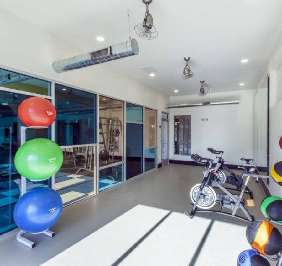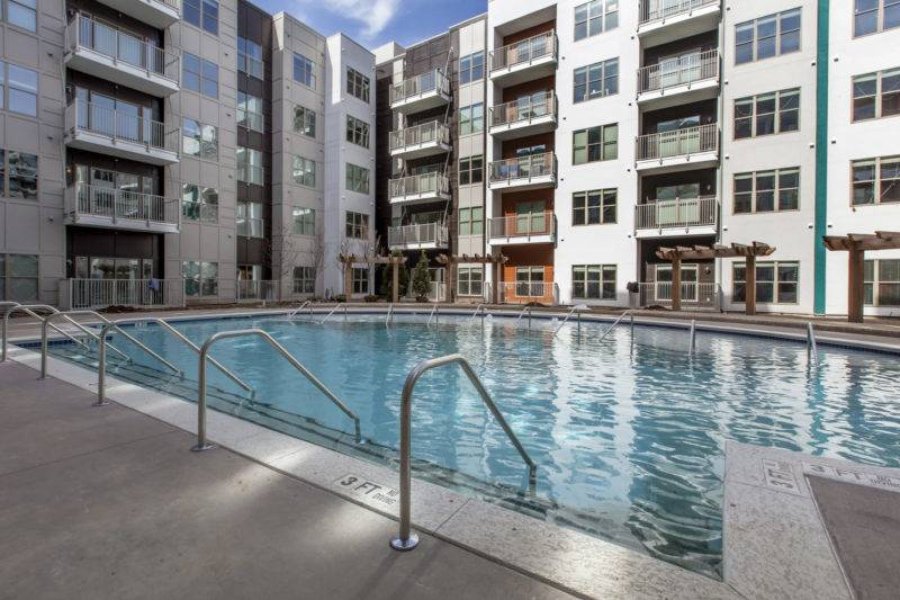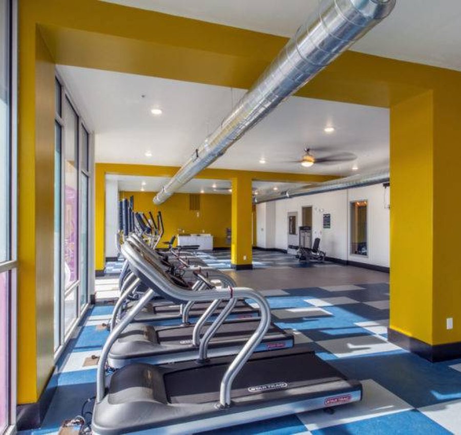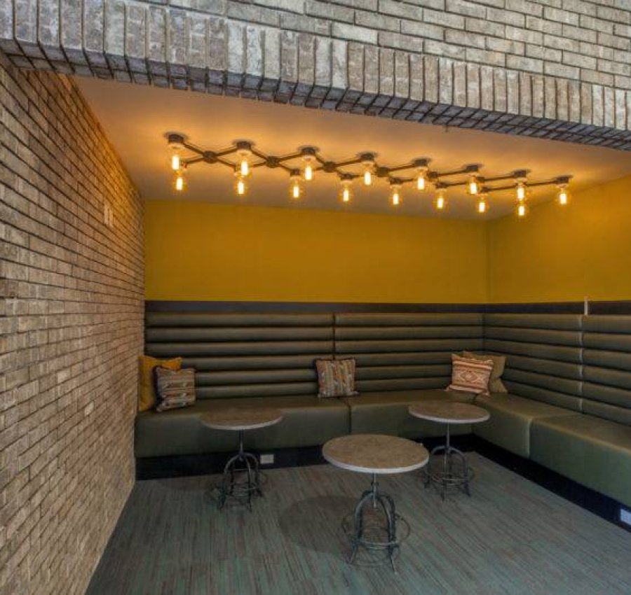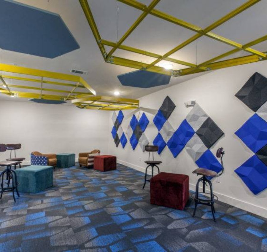 Focusing on resident comfort, extensive amenities are provided including a large club room opening up to the private courtyard with a music stage and built-in banquette seating. Additional amenity areas include a fitness studio, yoga and spin room, music room, art studio, dog spa, roof-top terrace, and coffee lounge. Unique finishes throughout the amenity area include stained concrete flooring with a map of Nashville, concrete and terrazzo bar tops, reclaimed whiskey barrel wood paneling, recycled glass tiling, AstroTurf, 3form features, and 1950s-style retro appliances.