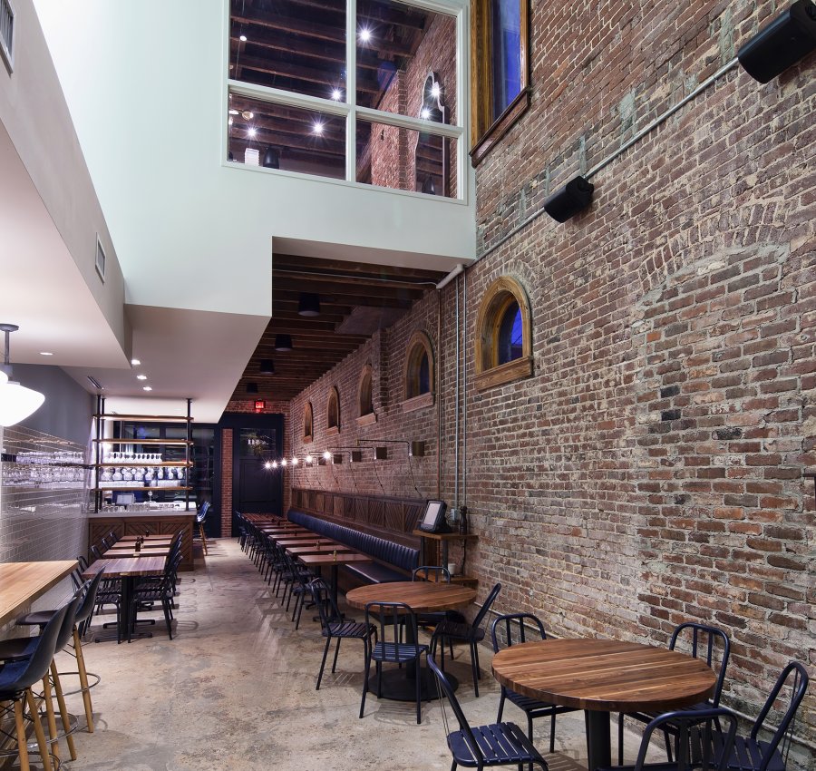 With a full bar and open kitchen, the interior space features exposed second-story wood framing, two sets of stairs to the upper level, and exposed sealed brick interior walls. Custom millwork includes a chef’s table, bar, upholstered booths and banquettes, replacement custom windows and the restoration of the existing historical storefront, which was covered up for a number of years.