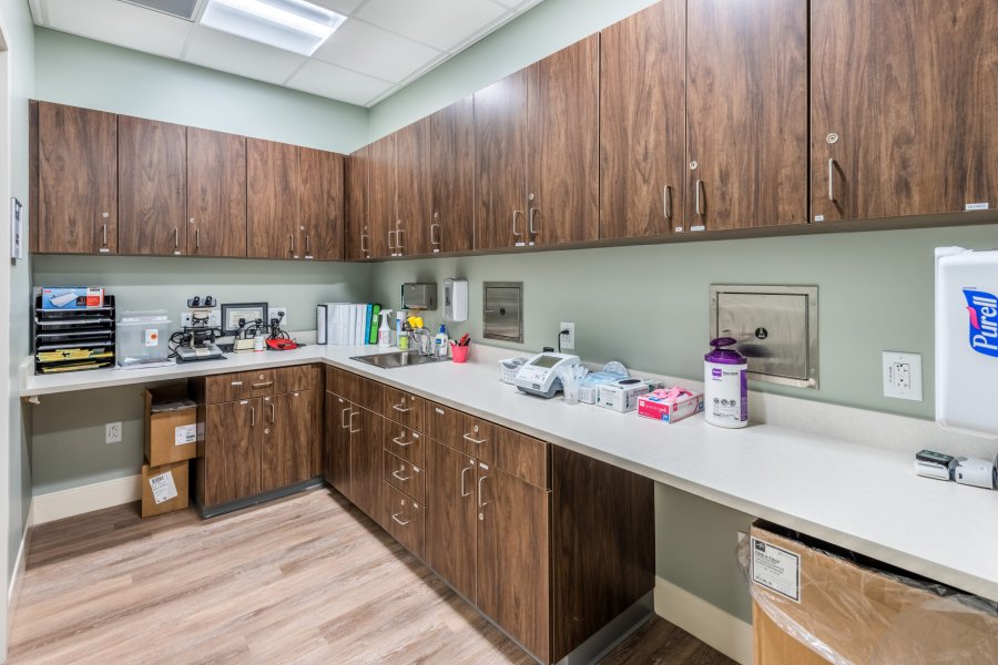 In addition to a welcoming lobby and waiting area, specialty fixtures are housed throughout the entirety of the clinic, from upscale lighting fixtures and acoustic wall panels that provide patients with an aesthetically inviting environment that also offers privacy by softening the sound carried throughout the space.