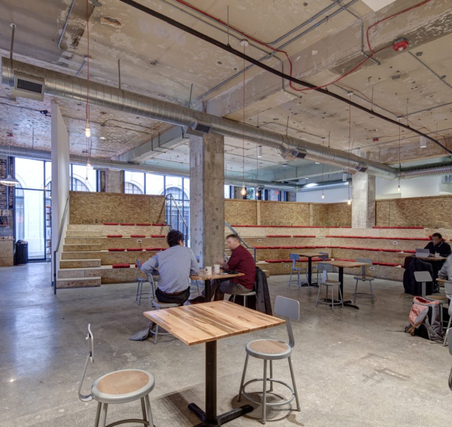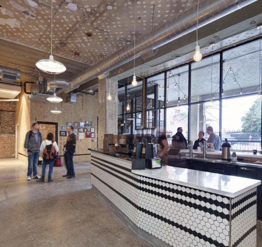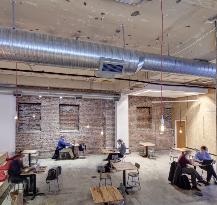 Part work-space, part coffee shop, part event space, and part incubator, the Switchyards Downtown Club is a members-only gathering place designed to accelerate learning and culminate relationships with consumer startups. Providing contemporary space for the creation of innovative products, the 1920s historic building is beautifully renovated in bustling downtown Atlanta. The first tenants were a law book publisher, Harrison Company, greeting card printer, Keelin Press, and Consolidated Tire Store. In the 1940s, Oxford Manufacturing Co. moved in and went public in the building in 1960. They were the longest running tenant from 1942 to 1965. Most recently a law firm, the four-story structure requires exterior renovations to the masonry and concrete walls after falling into disrepair upon the firm’s closing. The project creates new openings for windows and an exterior courtyard. The main event space utilizes raw-designed wooden stadium seating to surround a stage for startup owners and presenters. The in-house coffee shop on the first floor boasts a tile bar and granite counter tops while exposed industrial ductwork hangs above. The space enhances the local startup conversation and provides an open and innovative work-space for all members. Both full- and part-time members are able to partake in private offices, unlimited coffee, WiFi, as well as kitchen and shower accessibility.