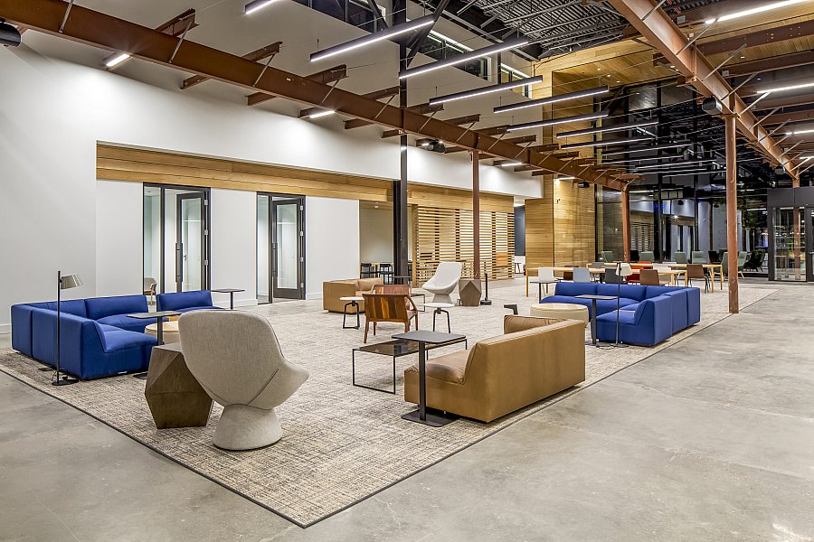 Interior demolition makes way for a beautiful, light-filled lobby that links two wings of the existing structure, creating the perfect space to grab a cup of Joe in the full-service coffee shop or gather with colleagues and enjoy a catered meal in the kitchenette. Reclaimed wood is used throughout. Completing the interior space is a modern fitness center featuring Peloton Bikes and TRX equipment.