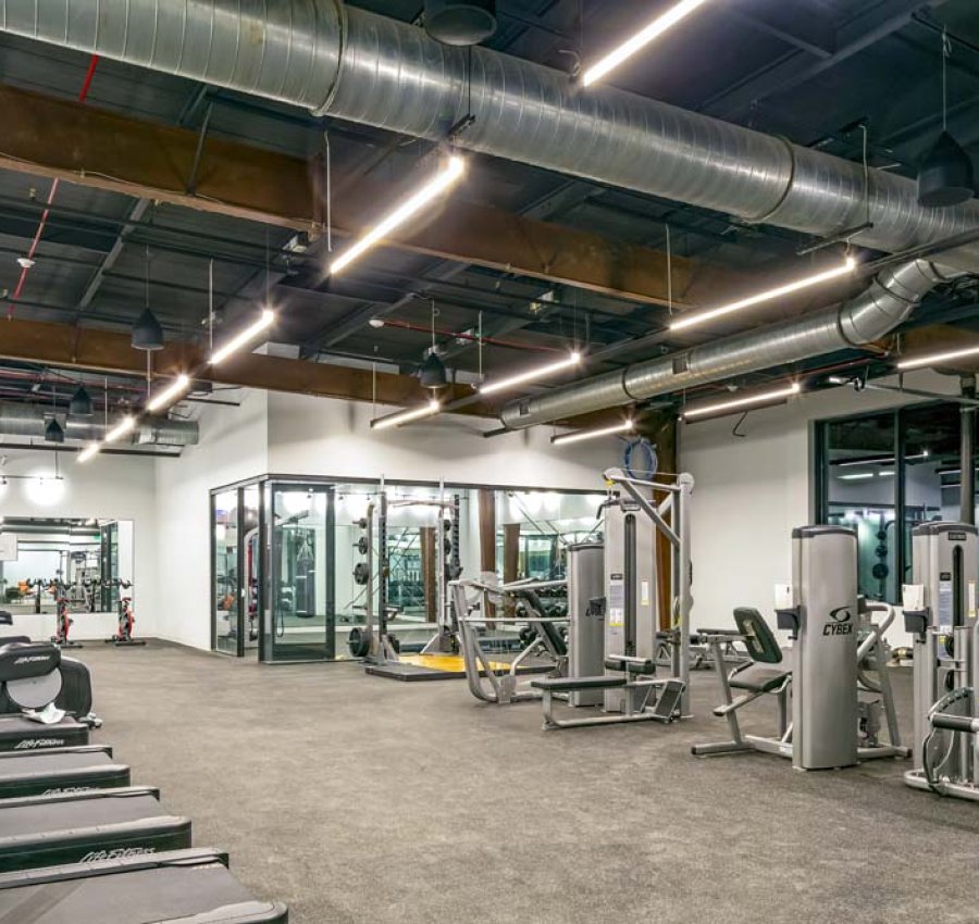 Interior demolition makes way for a beautiful, light-filled lobby that links two wings of the existing structure, creating the perfect space to grab a cup of Joe in the full-service coffee shop or gather with colleagues and enjoy a catered meal in the kitchenette. Reclaimed wood is used throughout. Completing the interior space is a modern fitness center featuring Peloton Bikes and TRX equipment.
