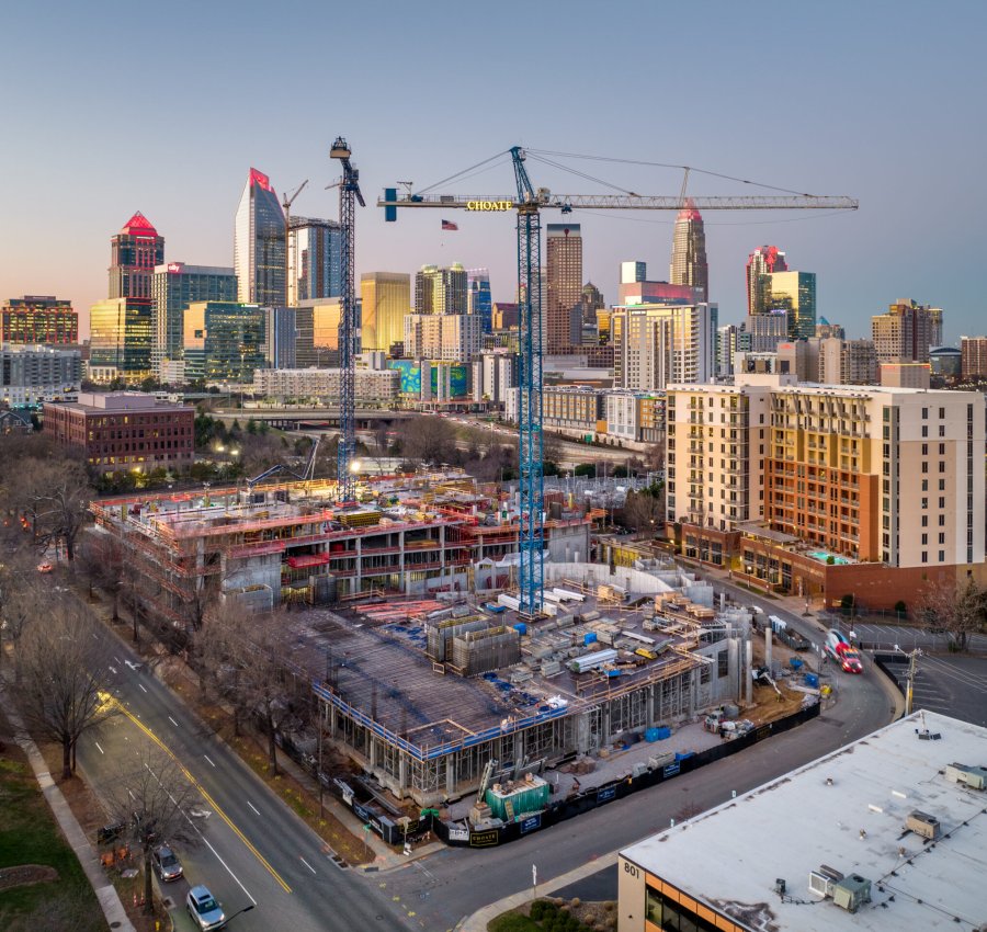 To reduce the potential for shrinkage and provide further strength in the foundations, the structure is built using post-tensioned concrete. Erecting a high-rise structure in a populated urban setting presents a range of considerations the project team tackles with fervor. With a 14-story commercial building sitting adjacent to this already-tight site, the team proactively coordinated the project schedule to address every detail, from delivery of materials to the movement of said materials throughout the site. Advanced planning and early communication with the client played critical roles in the early success of this senior living project.