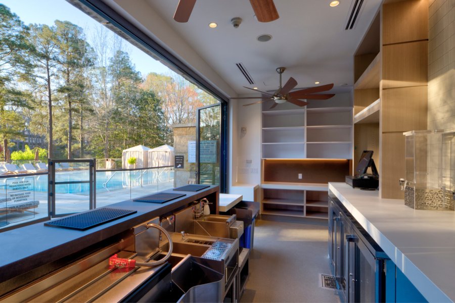 Working within an occupied space presents inherent challenges; therefore, the project team focused efforts on minimizing disruptions while maximizing construction productivity and safety. With a fast-tracked schedule and a tight (514-SF) space, the project team crafted an intricate schedule to allow for no more than two trade partners working on the walk-up pool bar expansion at one time.