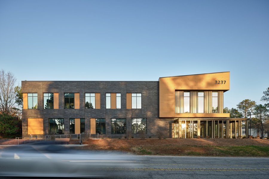 The building’s exterior showcases a striking blend of black brick, box-ribbed metal panels, architectural wood accents, and expansive glass storefronts. A dramatic, cantilevered canopy at the main entrance offers sheltered patient drop-off and pickup, enhancing convenience and comfort on a tight urban site. Inside, the team delivered a comprehensive medical space complete with sophisticated equipment, offices, patient rooms, conference rooms, and consulting spaces for patients and their providers.