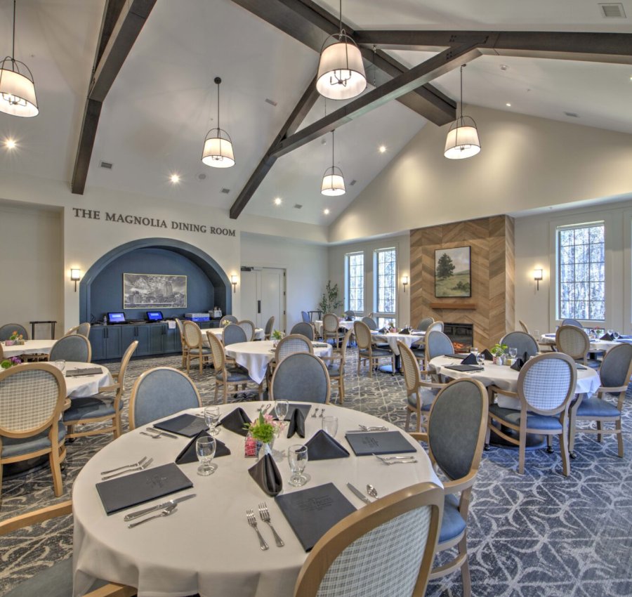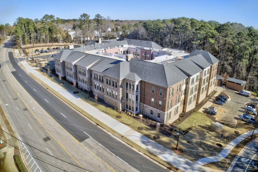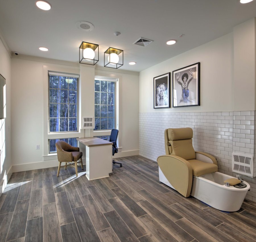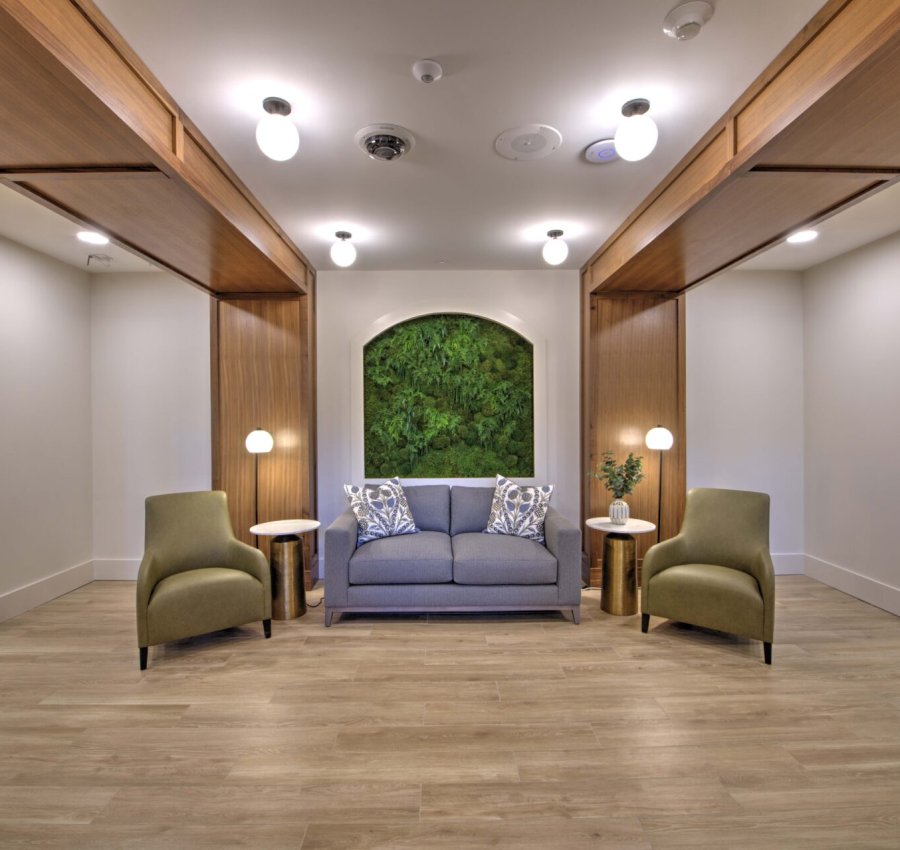 Rather than leveling the site, this four-story building steps across three distinct grade elevations, resulting in three separate ground-floor elevations designed to follow the natural topography. The team used cast-in-place stepped foundation walls and a three-step slab system to accommodate the existing grades. Once complete, the lowest level houses all back of house functions, including laundry, maintenance, and staff break areas, while the main entrance is positioned on what is technically the second floor due to the elevation changes.
