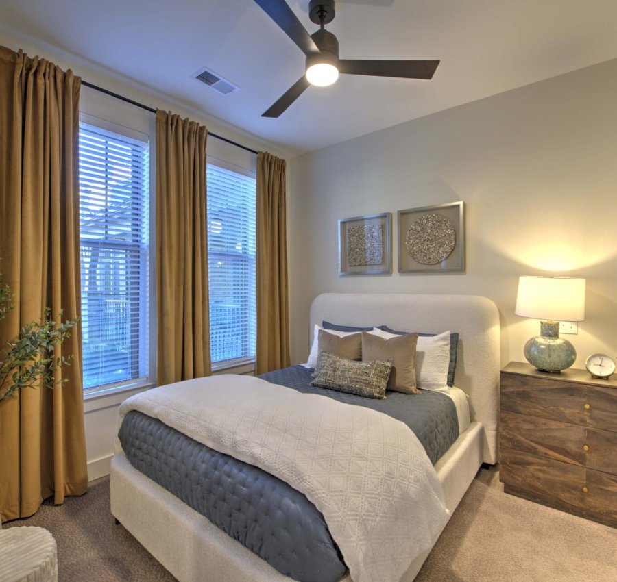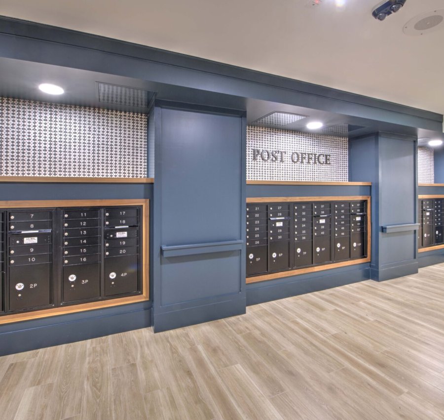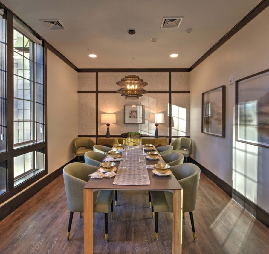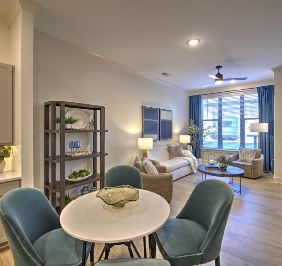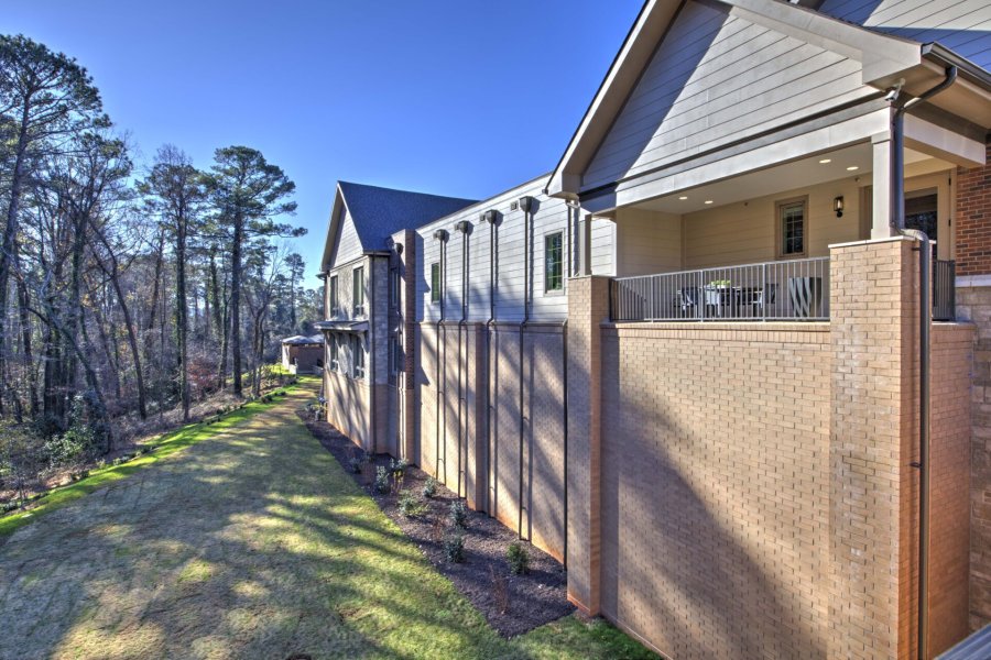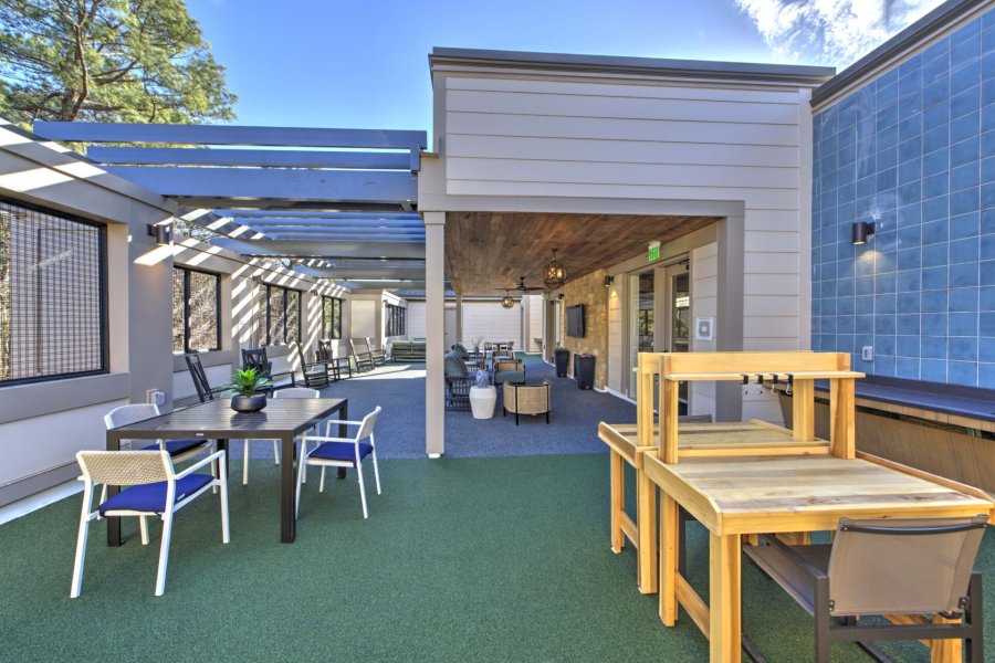 The pavilion serves as the courtyard’s focal point and offers a year-round gathering, grilling, and gaming area for residents. A gas fireplace with a brick surround provides heat in cooler months, while the roof delivers shade during hot North Carolina summers.