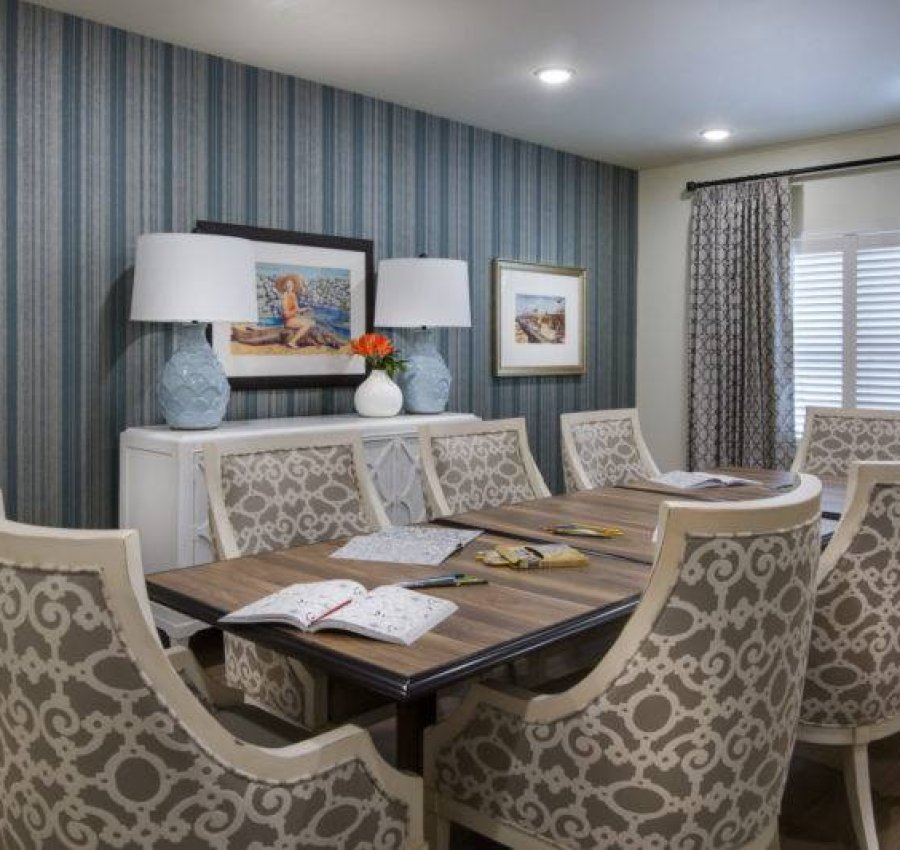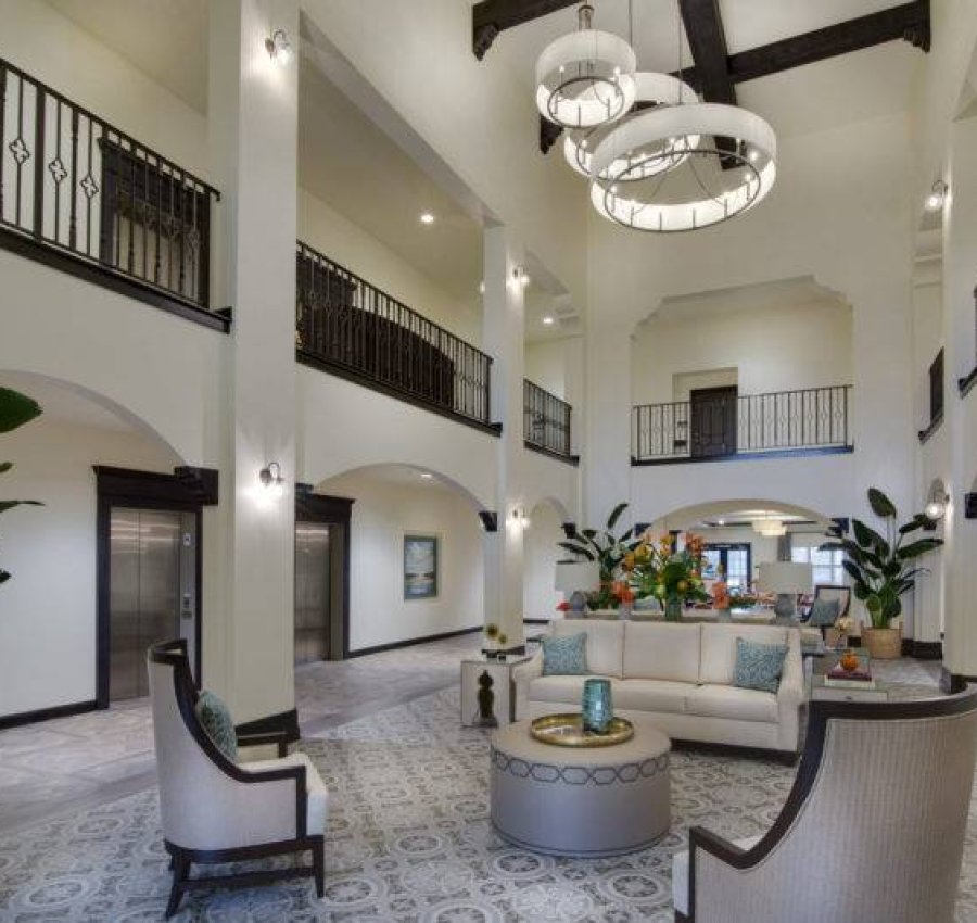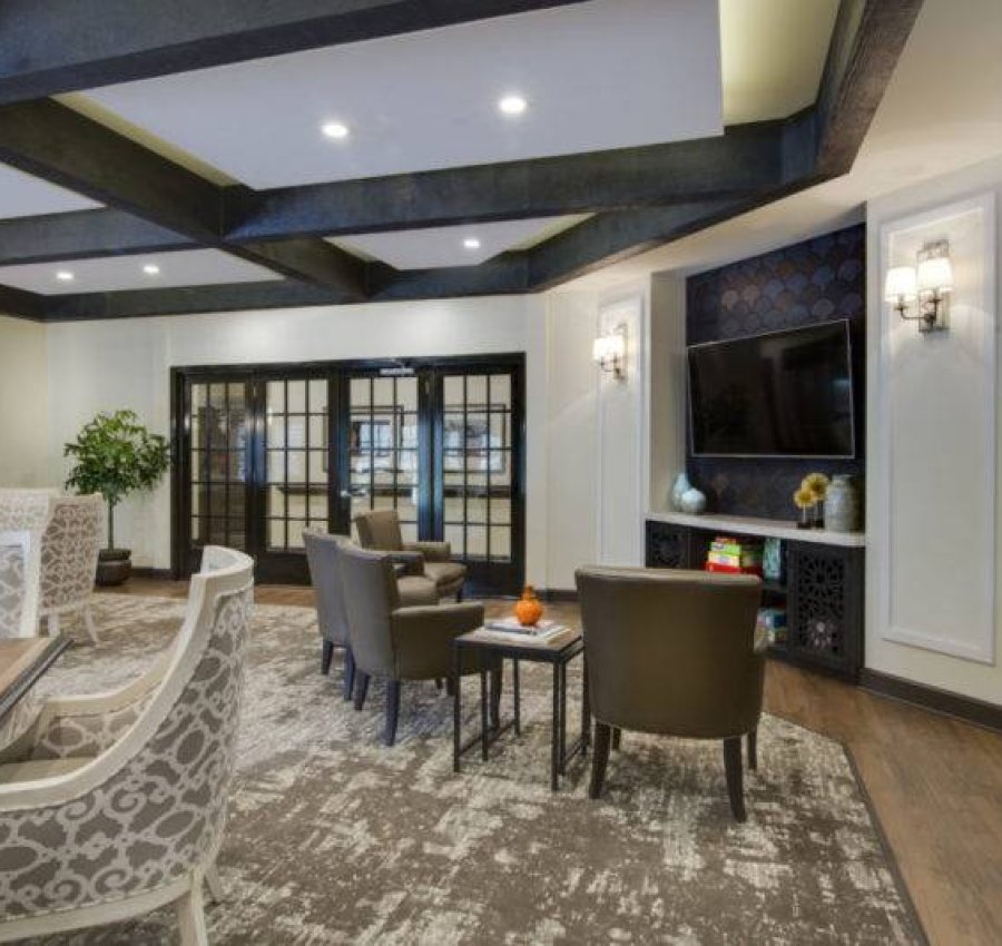 This facility offers an abundance of first-class features: a full-service kitchen, multiple dining areas, library, bistro and parlor, lounges, fitness center, spa, salon, and more. The interior is beautifully decorated with unique wall coverings, water fountain in the lobby, inviting fireplace, and rustic wood ceiling beams.