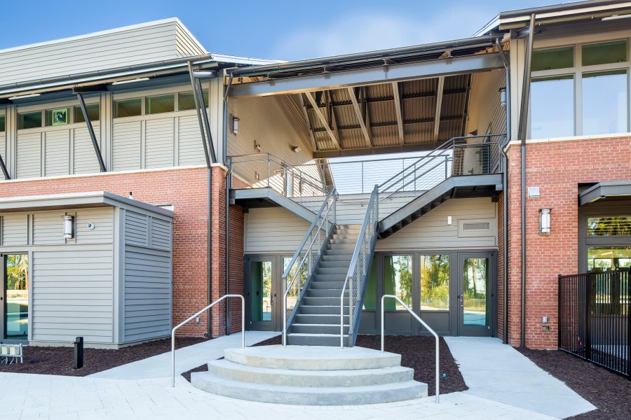 The complex stands two stories tall, with a combination of brick and fiber-cement siding exteriors and aluminum storefronts that provide a sleek yet sturdy exterior. Additionally, Thermory wood screening was installed around the east staircase, deck, and terrace. Thermory wood has been, as the name suggests, “thermally” modified to withstand incredible amounts of moisture and offer resistance against rot for more than 25 years, providing owners with attractive wood furnishings for years to come. Ornamental cable rails are used for all exterior patios and stairways and topping off the structure is a standing-seam metal roof, giving the complex a modern rustic look that flatters the surrounding scenery.
