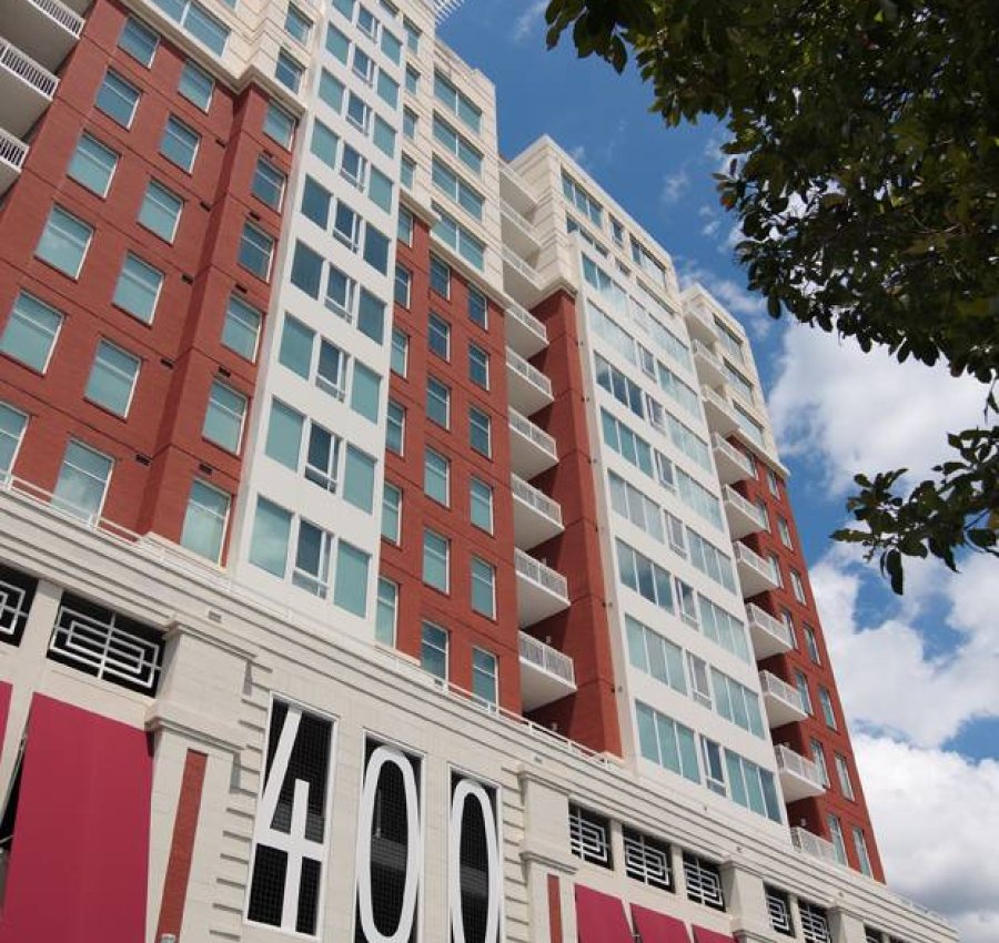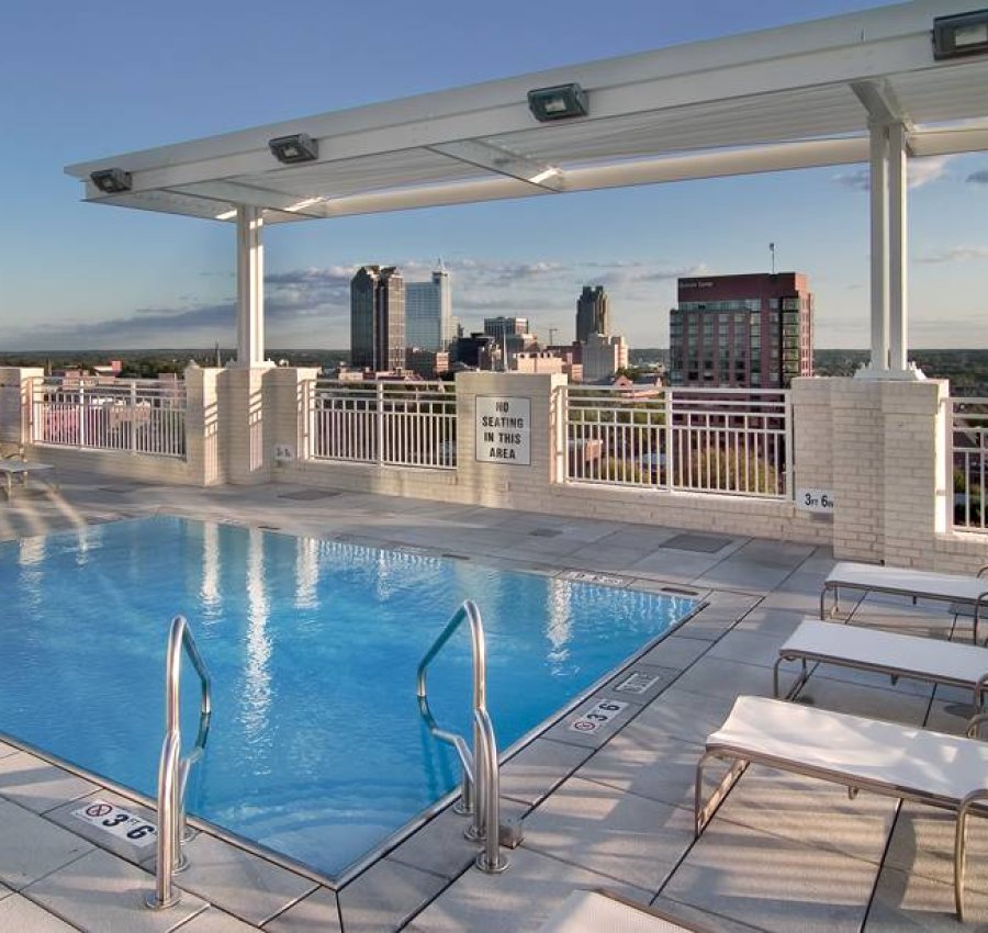 Amenities include fitness facility, meeting rooms and a roof-top pool with dramatic views of Raleigh. The building is a cast-in-place post-tensioned concrete structure for the residential tower and conventionally reinforced concrete structure for the parking and retail levels. The exterior skin is composed of architectural cast stone, brick masonry, aluminum storefront and metal panels which all combine to deliver one of the most attractive buildings in Raleigh.