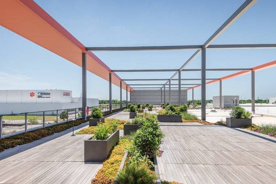Due to its location adjacent to the Cooper River at the site of the former naval warehouse building #1174, the Graduate Education Center requires structural support by deep pile foundations and cast-in-place concrete columns and slab. The main structure is comprised of structural steel beams and columns with full glass curtain walls and a rain-screen ACM metal panel system. A two-ply modified bitumen system tops the facility and integrates a green roof and an open terrace viewing deck. The mechanical systems are also housed on the roof level.
